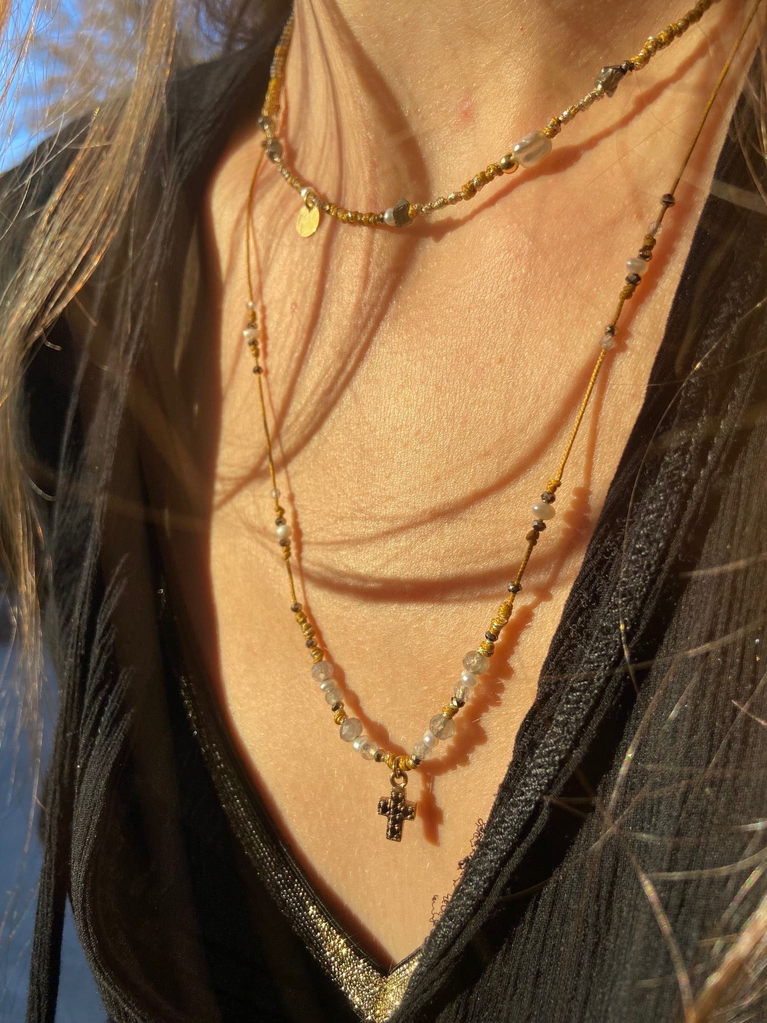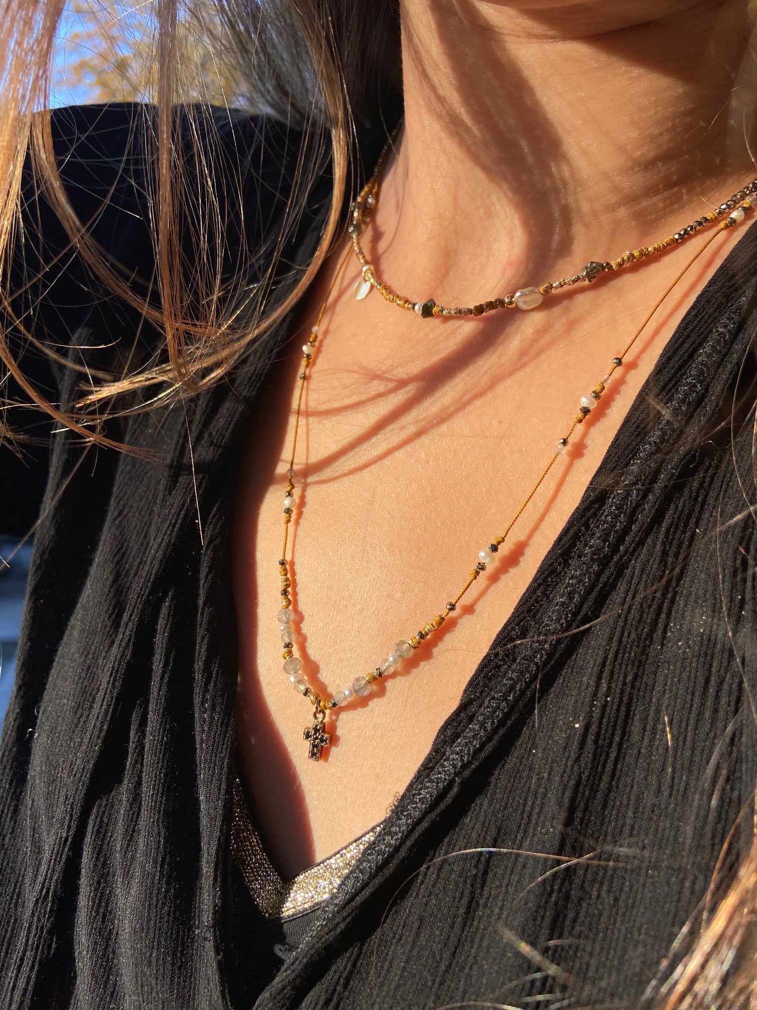 The elegance of pearls meets modernity in the "Éclat de Perle" collection. Bracelets and chokers combine freshwater pearls, Tahitian Keshi pearls, and gold-plated elements, such as star or heart pendants. The designs, mounted on multicolored or bronze sliding links, also incorporate rubies, pyrites, and labradorites, offering a refined and luminous style, perfect for enhancing your summer outfits.