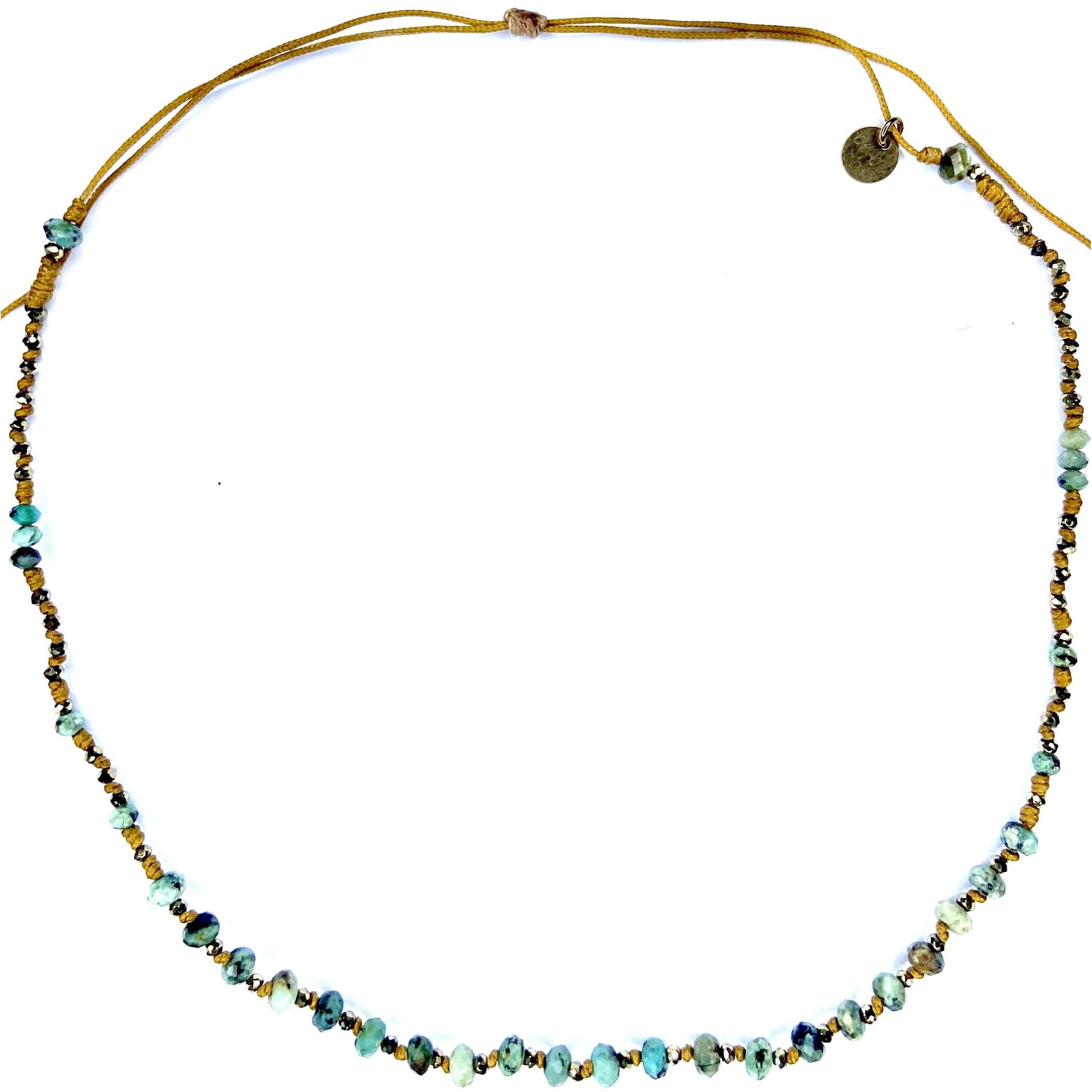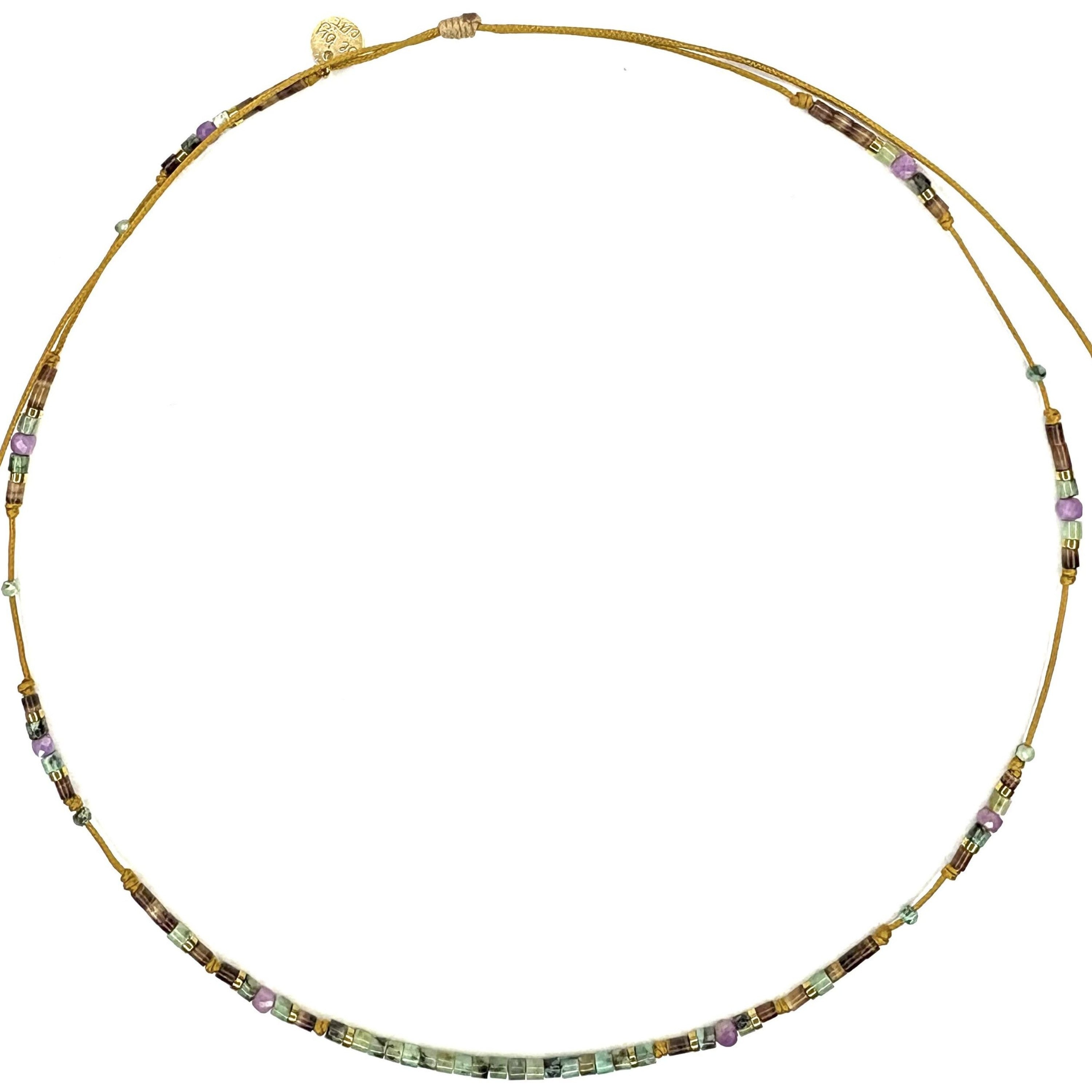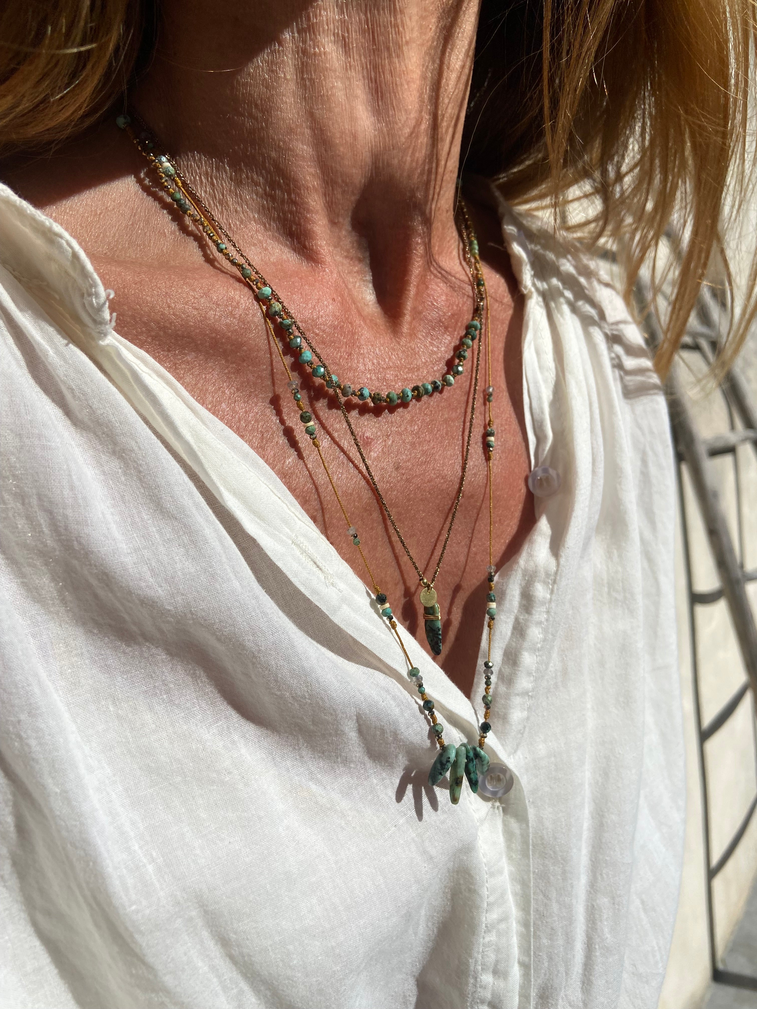 The Bohemia collection features elegant, bohemian bracelets and necklaces made from African turquoise, labradorite, pyrite, hematite, mother-of-pearl, tourmaline, amethyst, fluorite, kunzite, and Tahitian Keshi pearls. They are mounted on sliding links in bronze, gold, camel, or colored shades. The collection uses natural materials for an authentic, bohemian style.