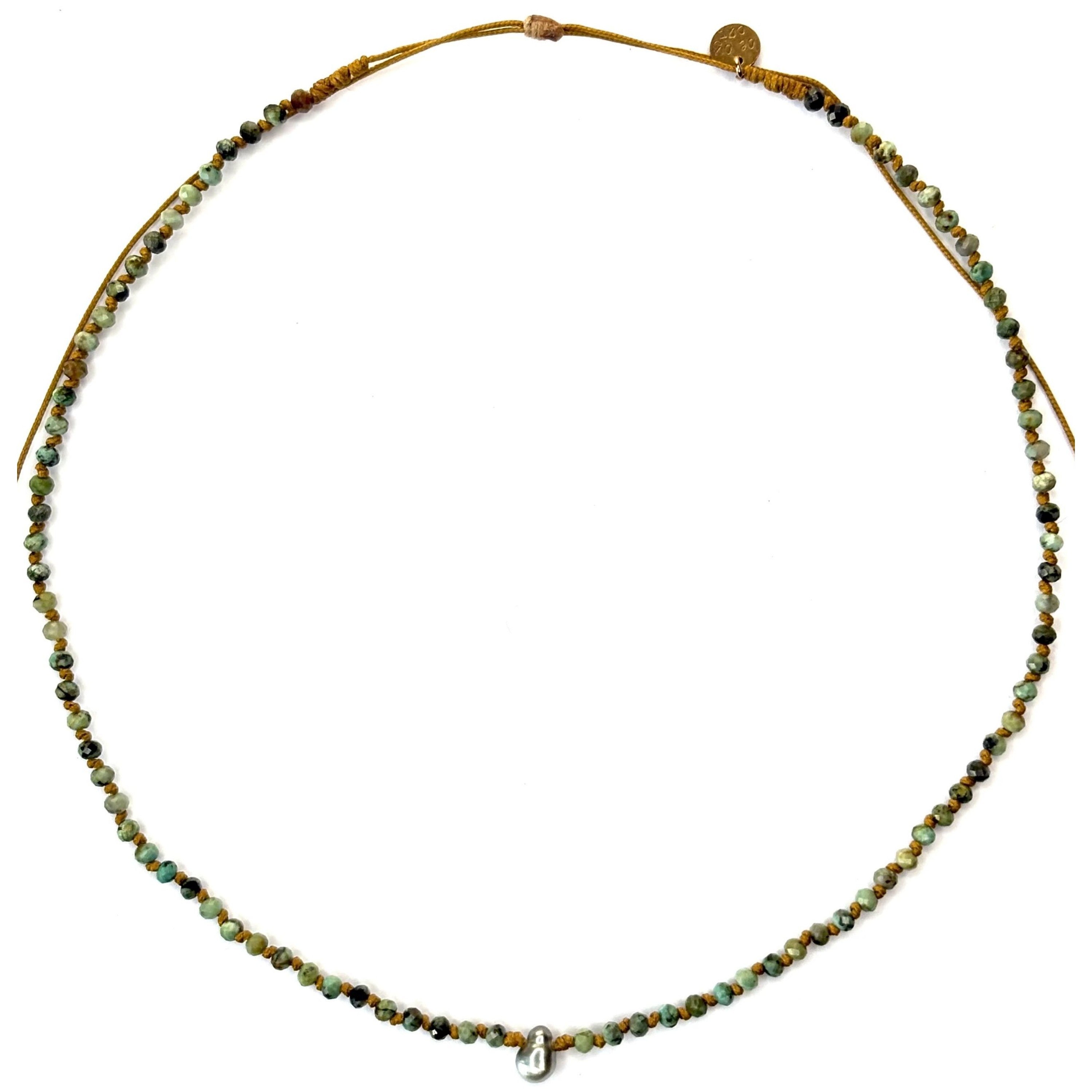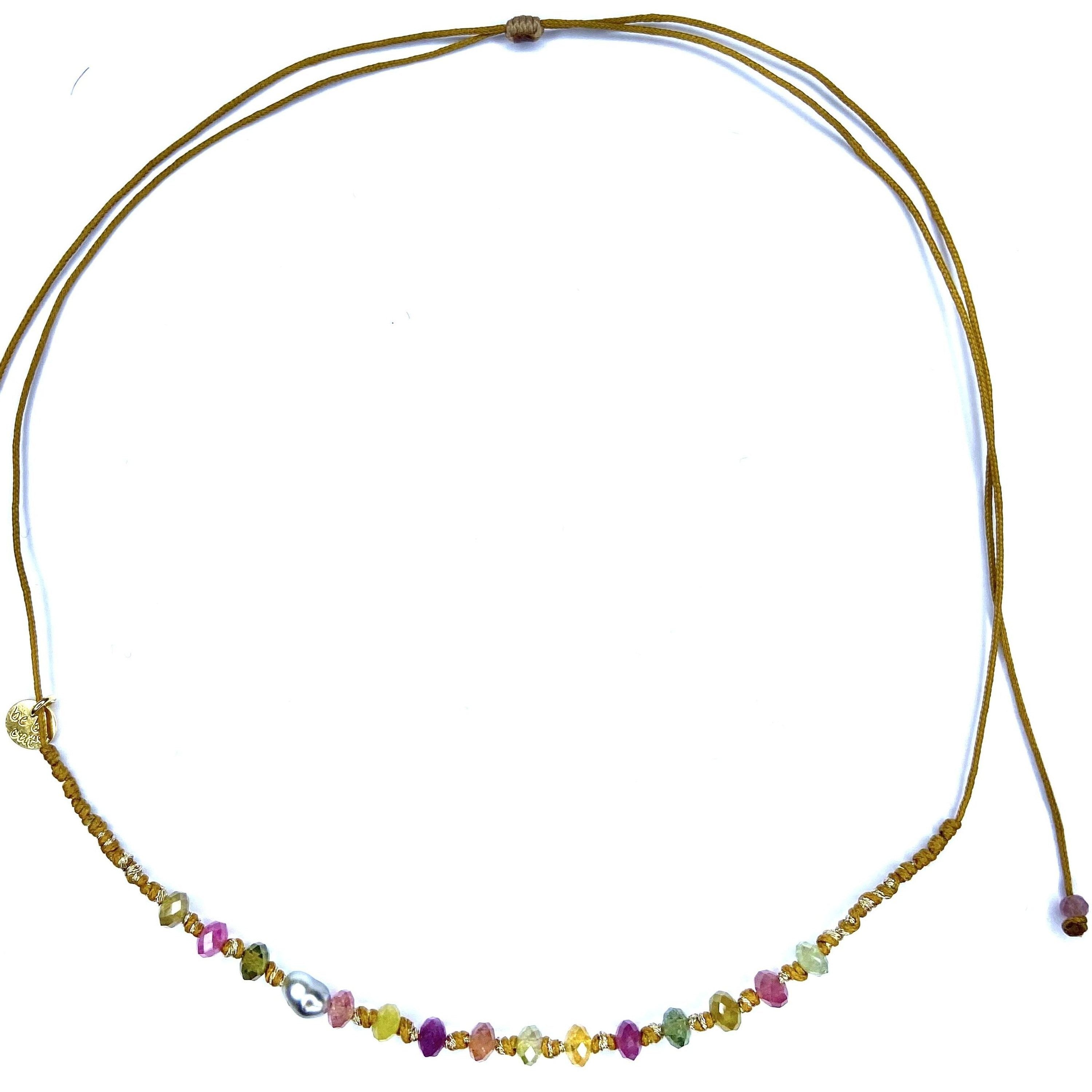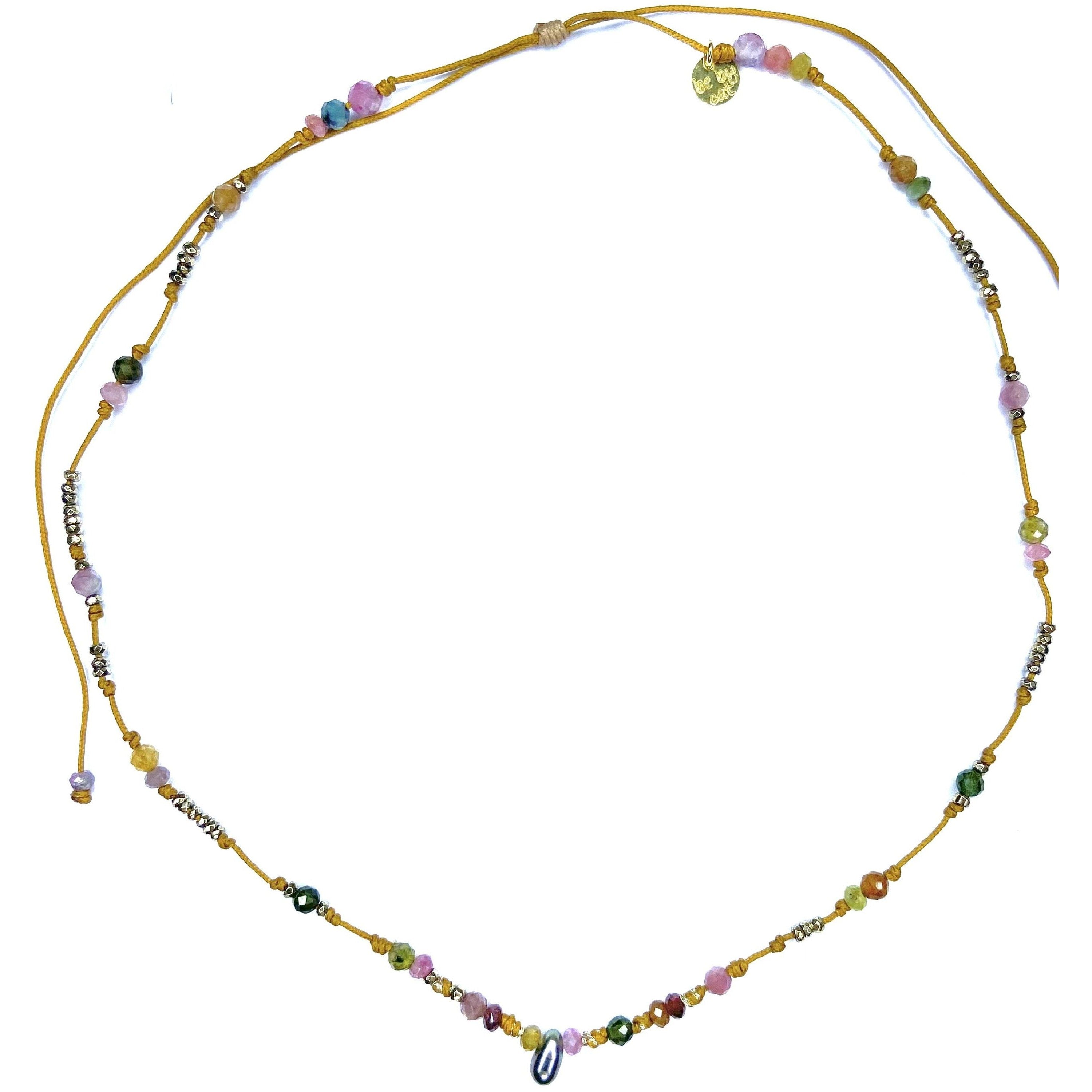 The Bohemia collection features elegant, bohemian bracelets and necklaces made from African turquoise, labradorite, pyrite, hematite, mother-of-pearl, tourmaline, amethyst, fluorite, kunzite, and Tahitian Keshi pearls. They are mounted on sliding links in bronze, gold, camel, or colored shades. The collection uses natural materials for an authentic, bohemian style.