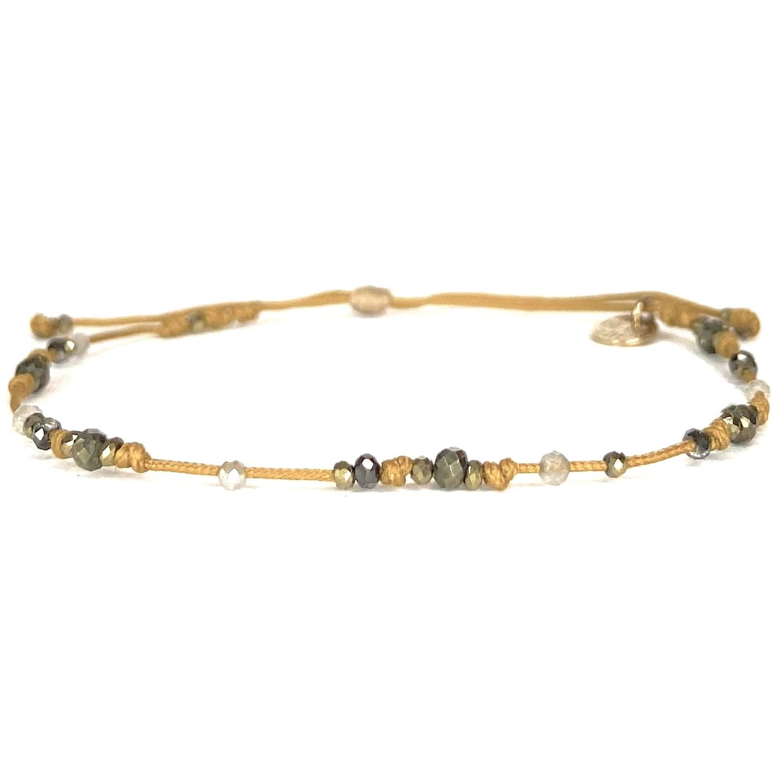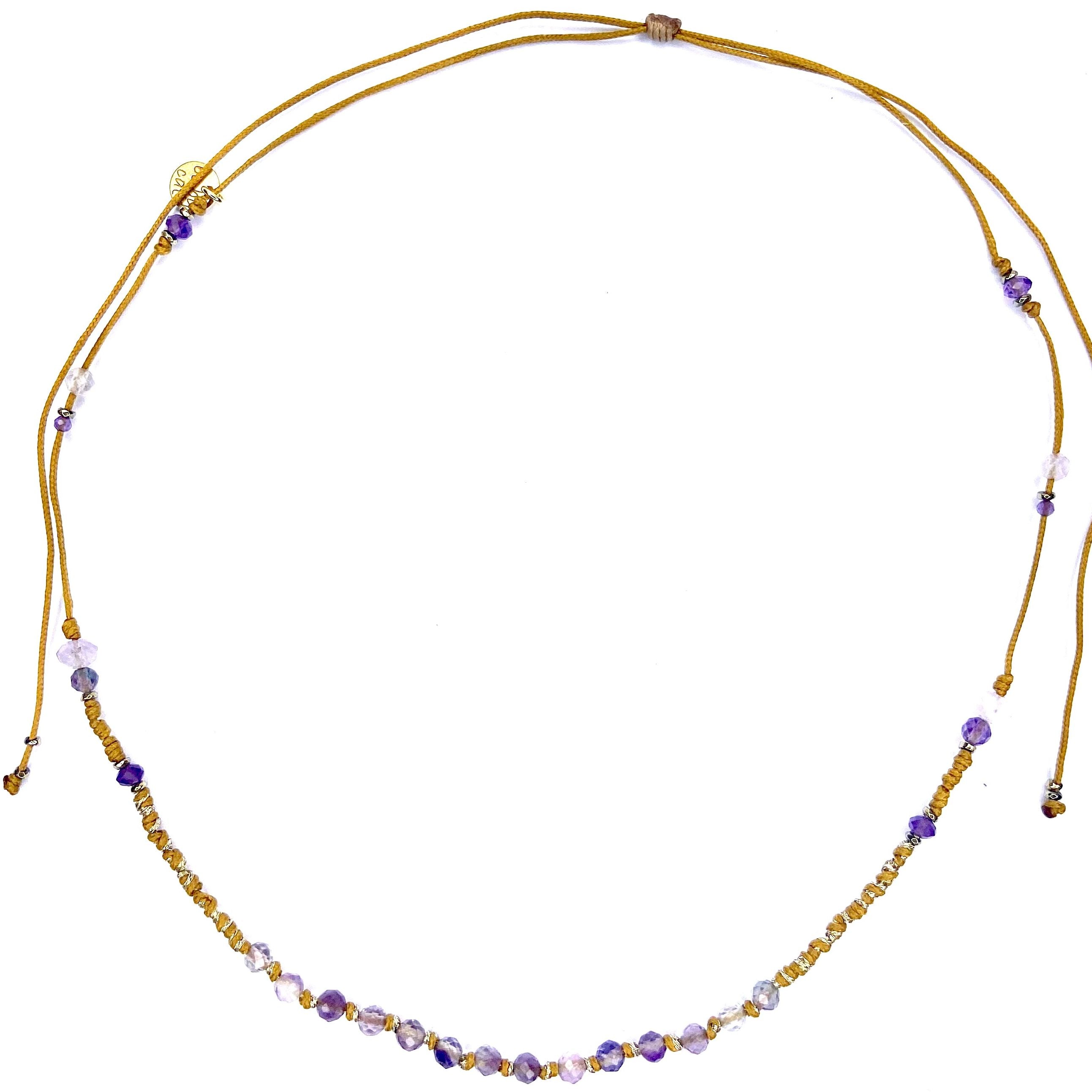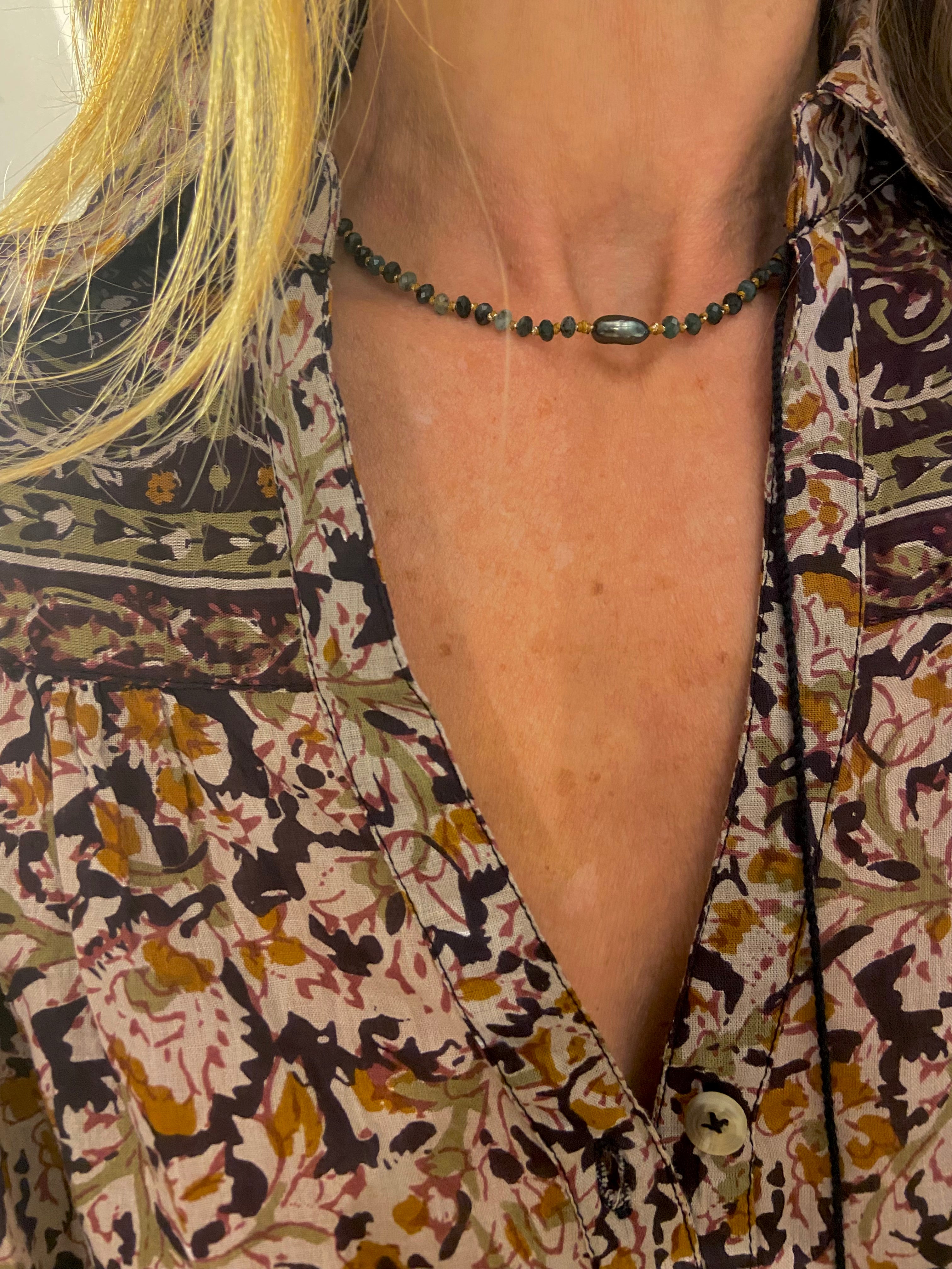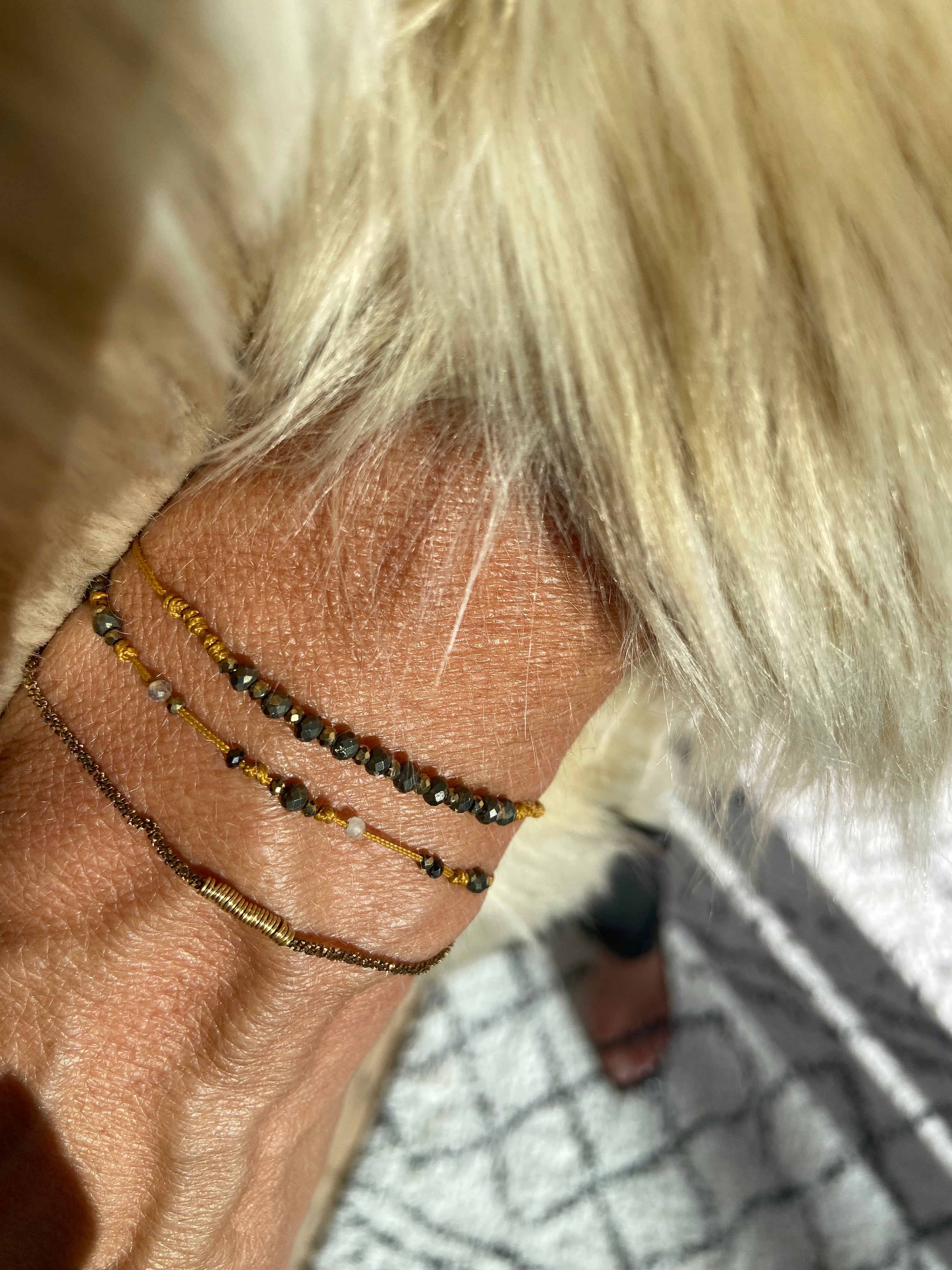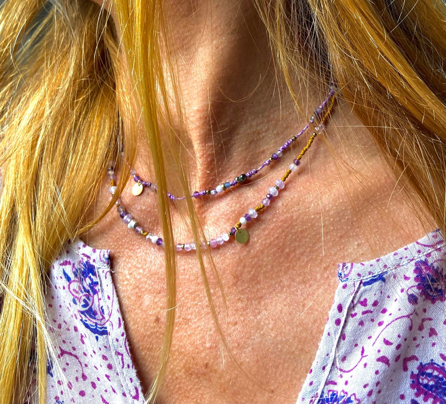 The Bohemia collection features elegant, bohemian bracelets and necklaces made from African turquoise, labradorite, pyrite, hematite, mother-of-pearl, tourmaline, amethyst, fluorite, kunzite, and Tahitian Keshi pearls. They are mounted on sliding links in bronze, gold, camel, or colored shades. The collection uses natural materials for an authentic, bohemian style.