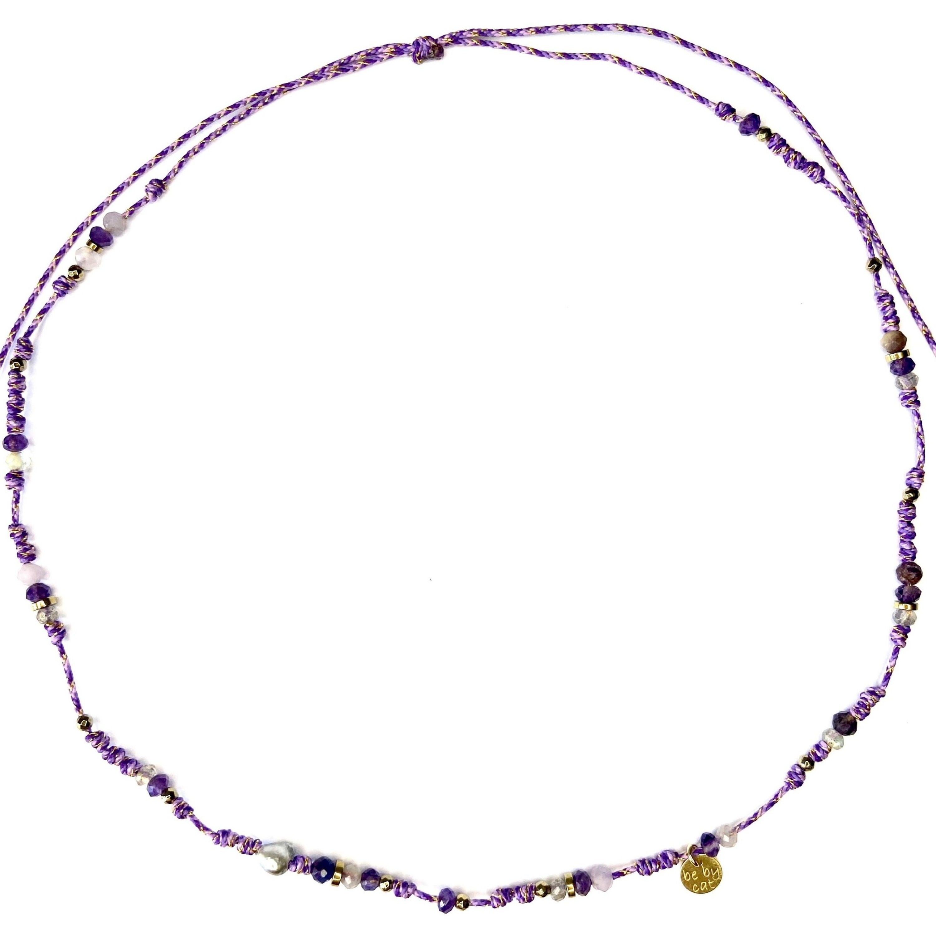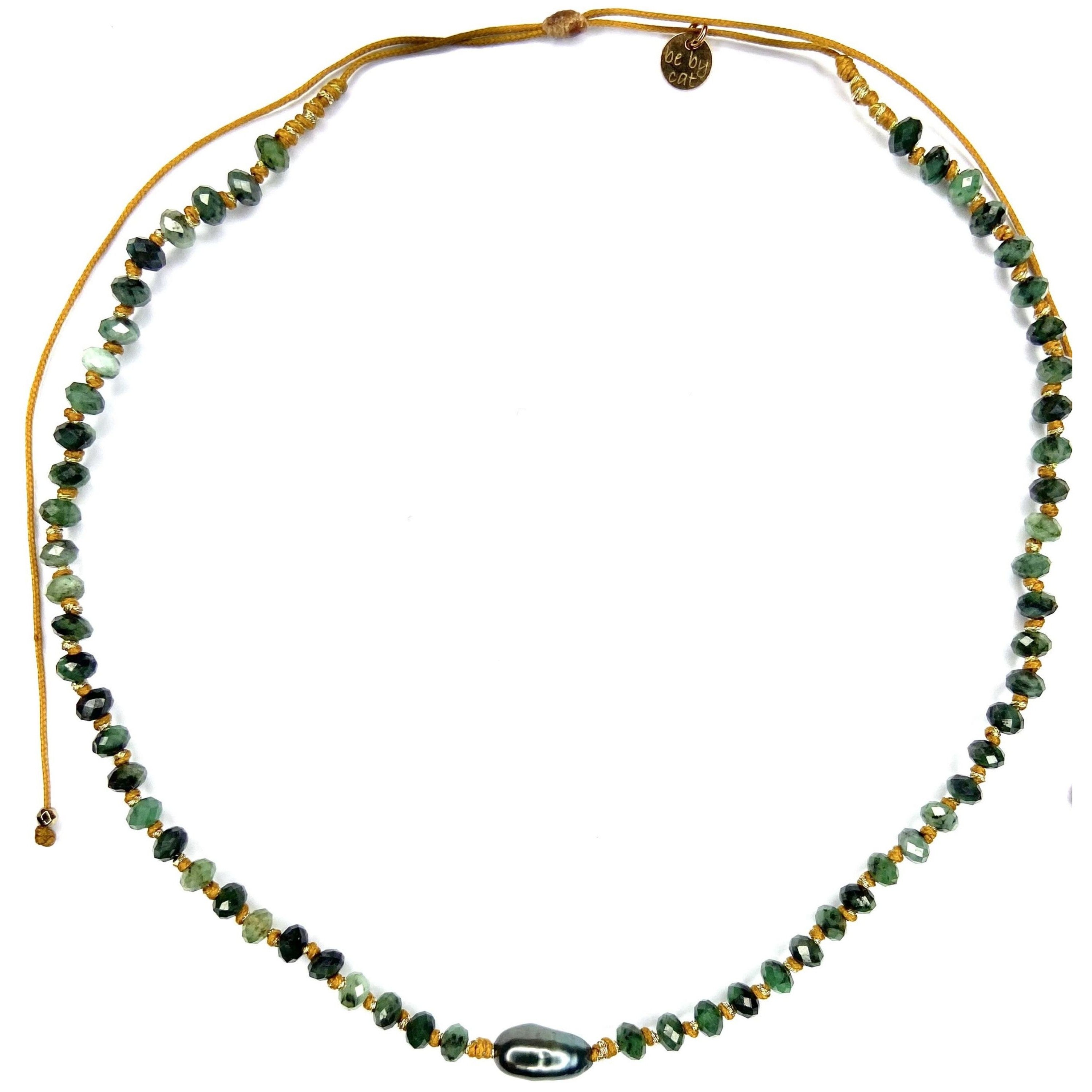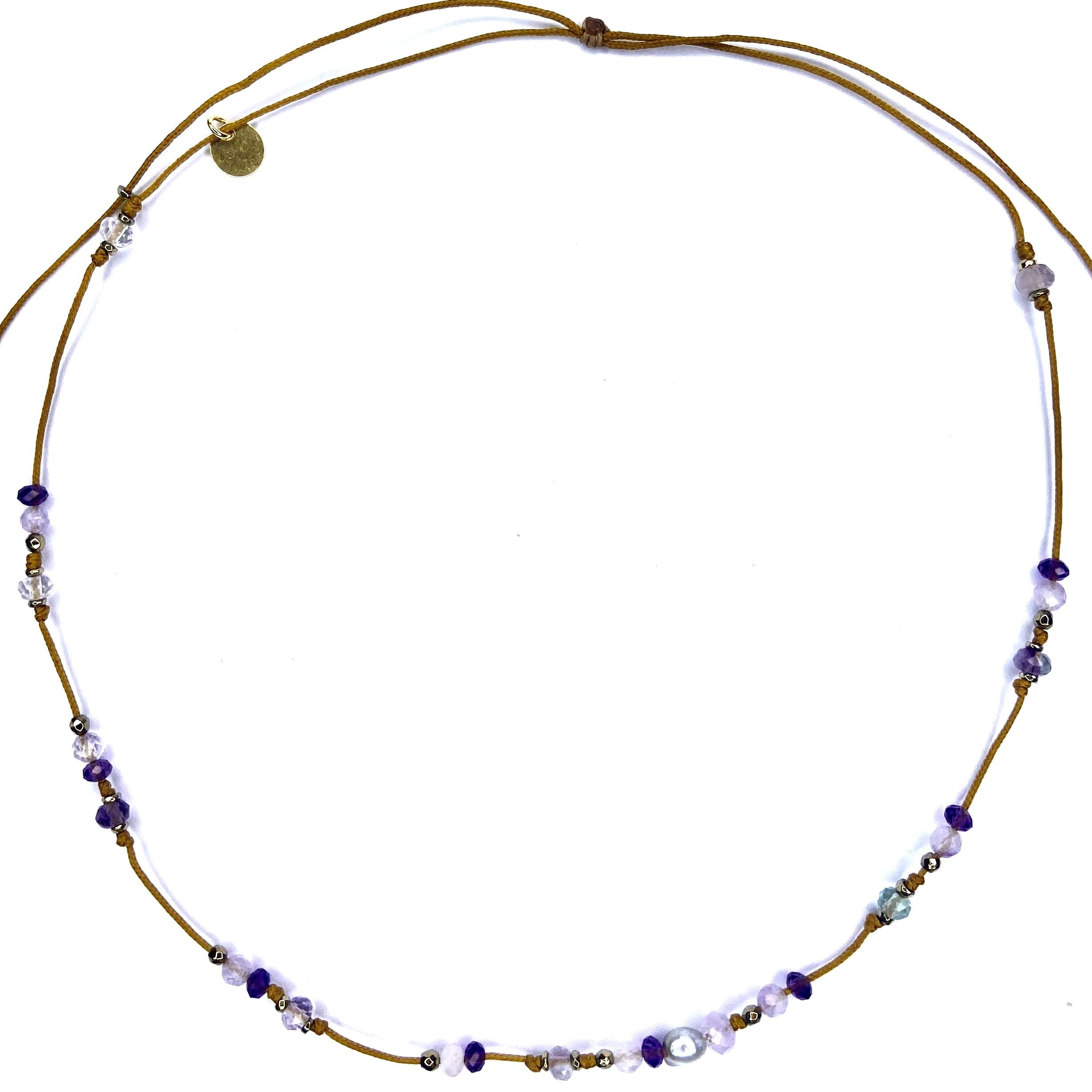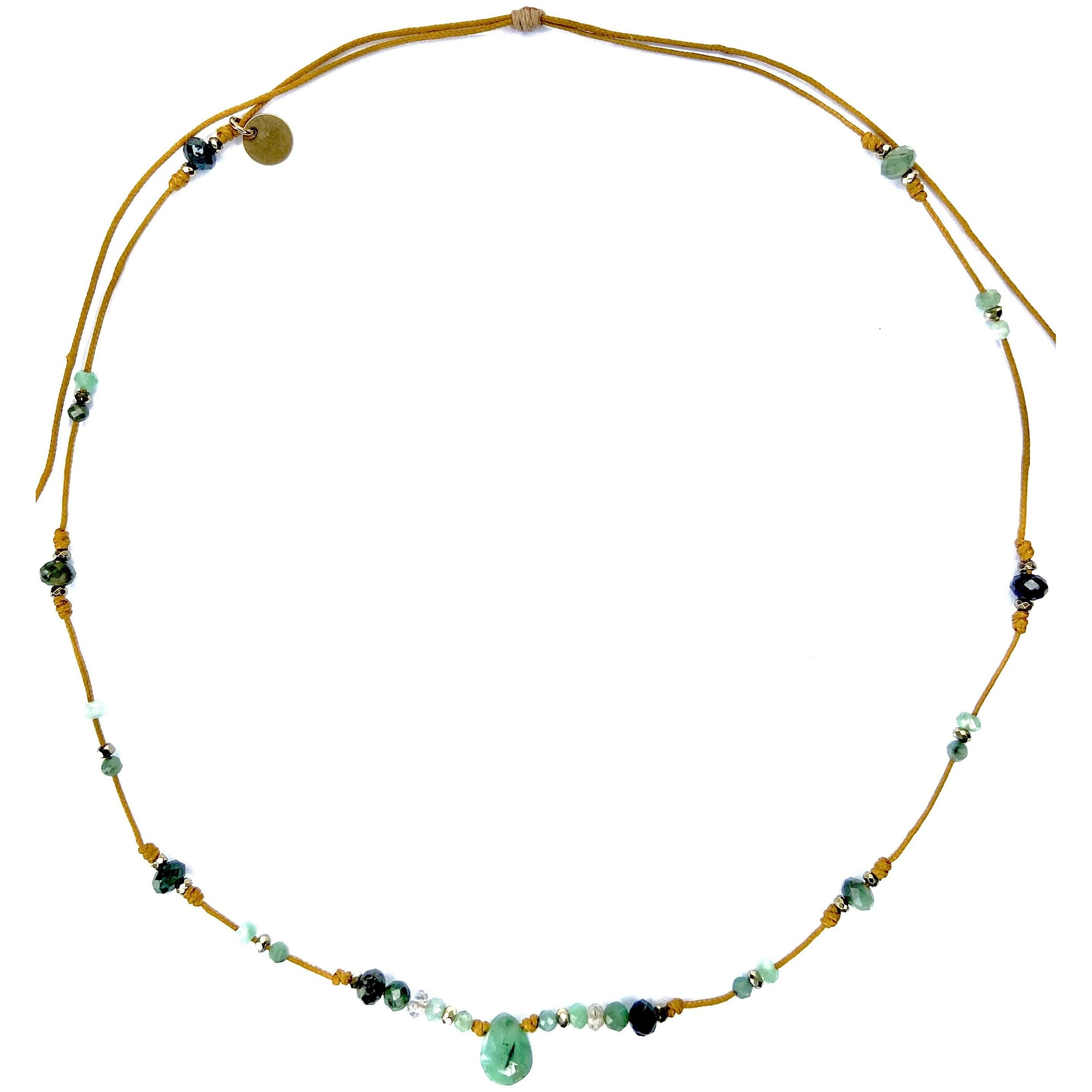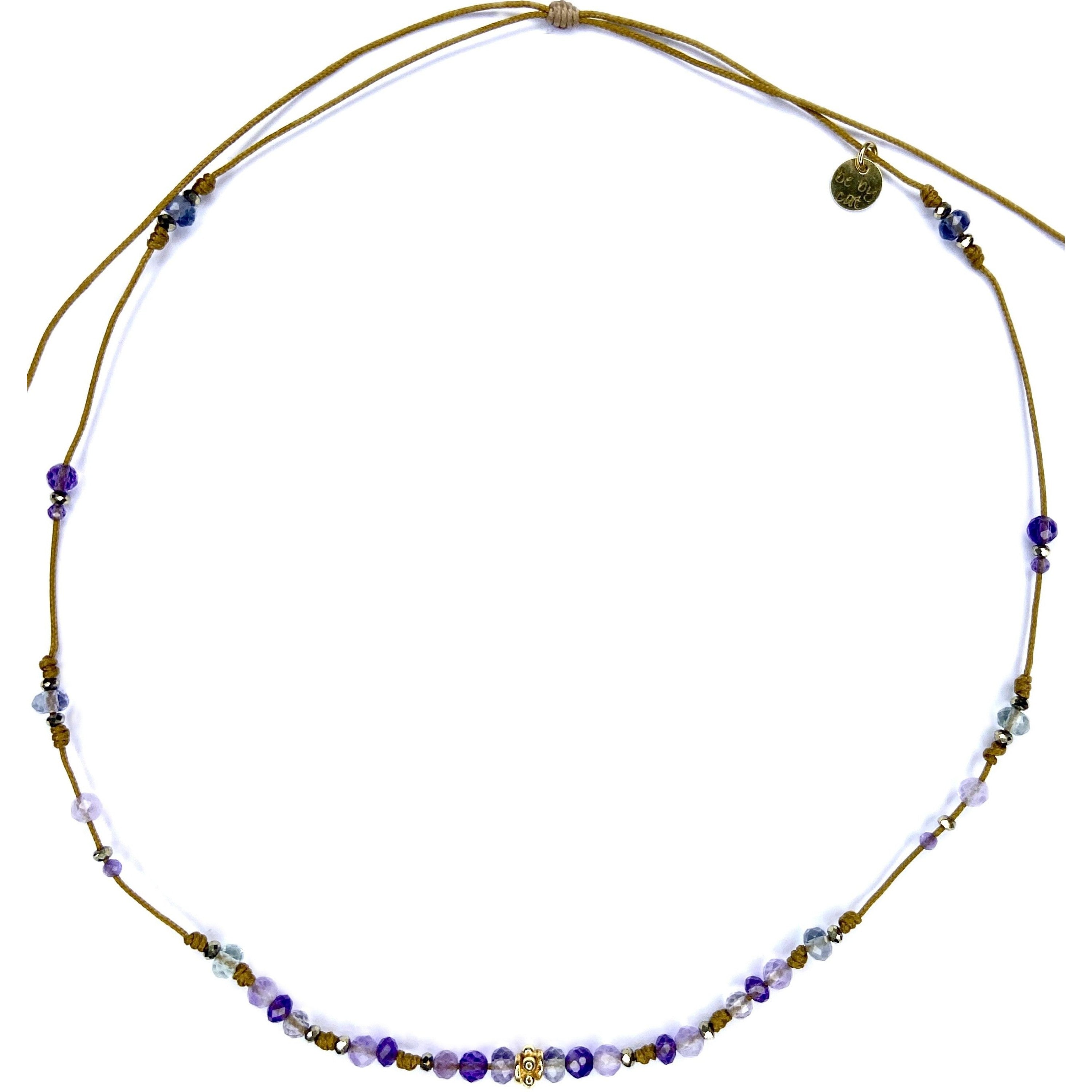 The Bohemia collection features elegant, bohemian bracelets and necklaces made from African turquoise, labradorite, pyrite, hematite, mother-of-pearl, tourmaline, amethyst, fluorite, kunzite, and Tahitian Keshi pearls. They are mounted on sliding links in bronze, gold, camel, or colored shades. The collection uses natural materials for an authentic, bohemian style.