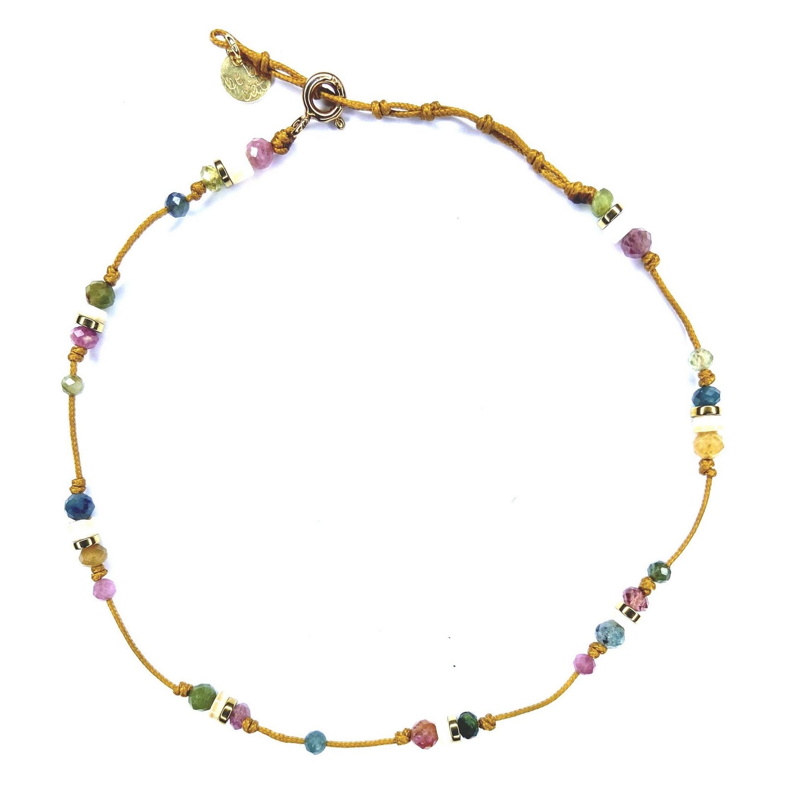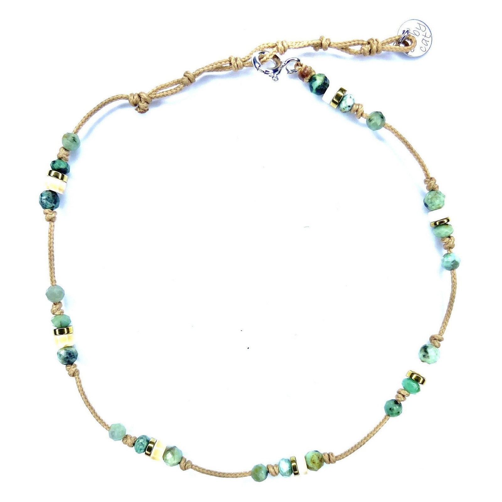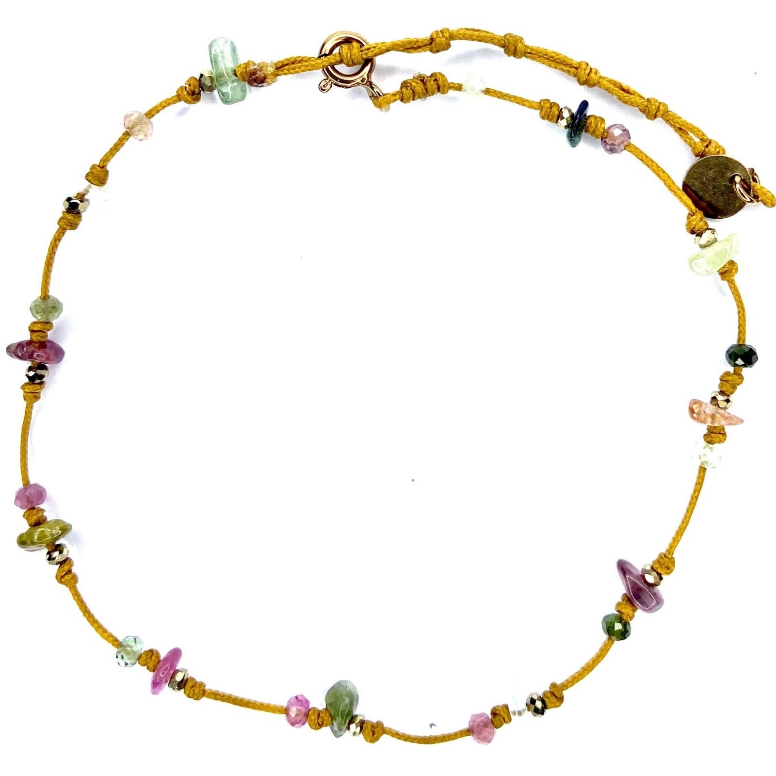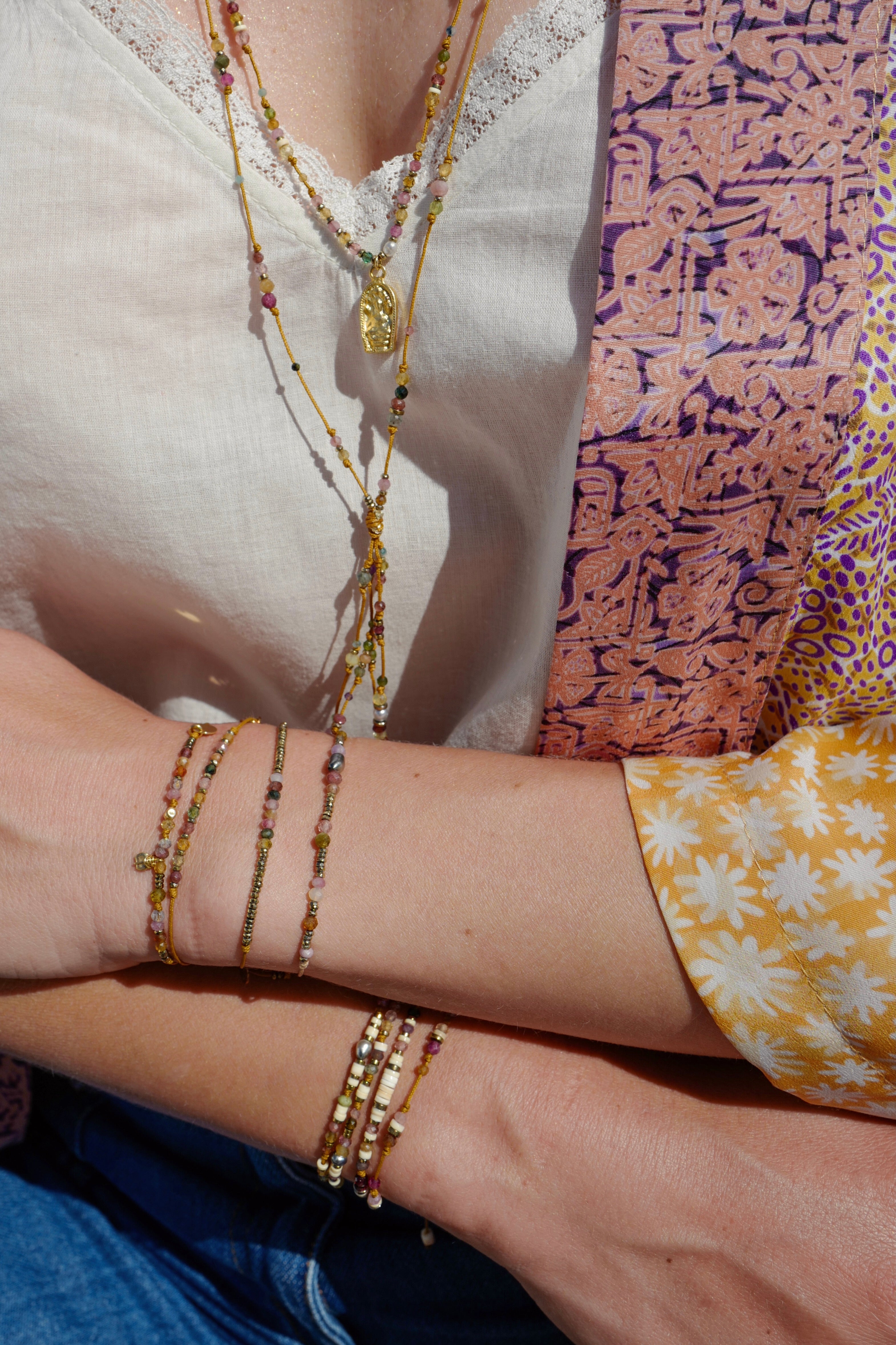 La collection Bohême propose des bracelets et des colliers bohèmes et élégants, composés de turquoises d'Afrique, de labradorites, de pyrites, d'hématites, de nacre, de tourmalines, d'améthystes, de fluorites, de kunzites et de perles Keshi de Tahiti. Ils sont montés sur des liens coulissants mordorés, dorés, camel ou colorés. La collection utilise des matériaux naturels pour un style bohème et authentique.