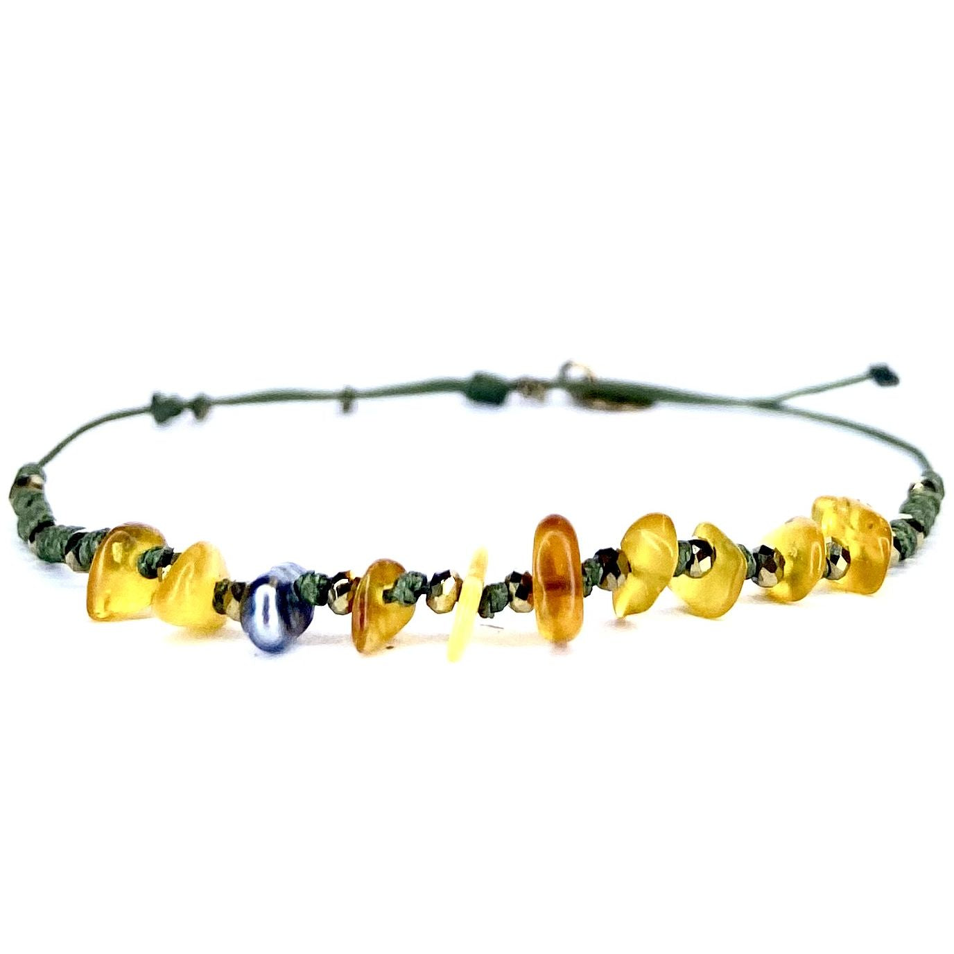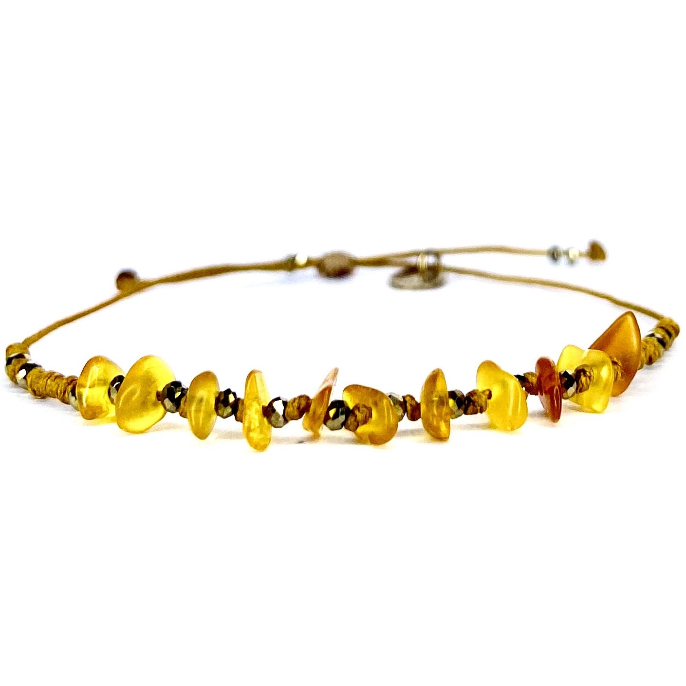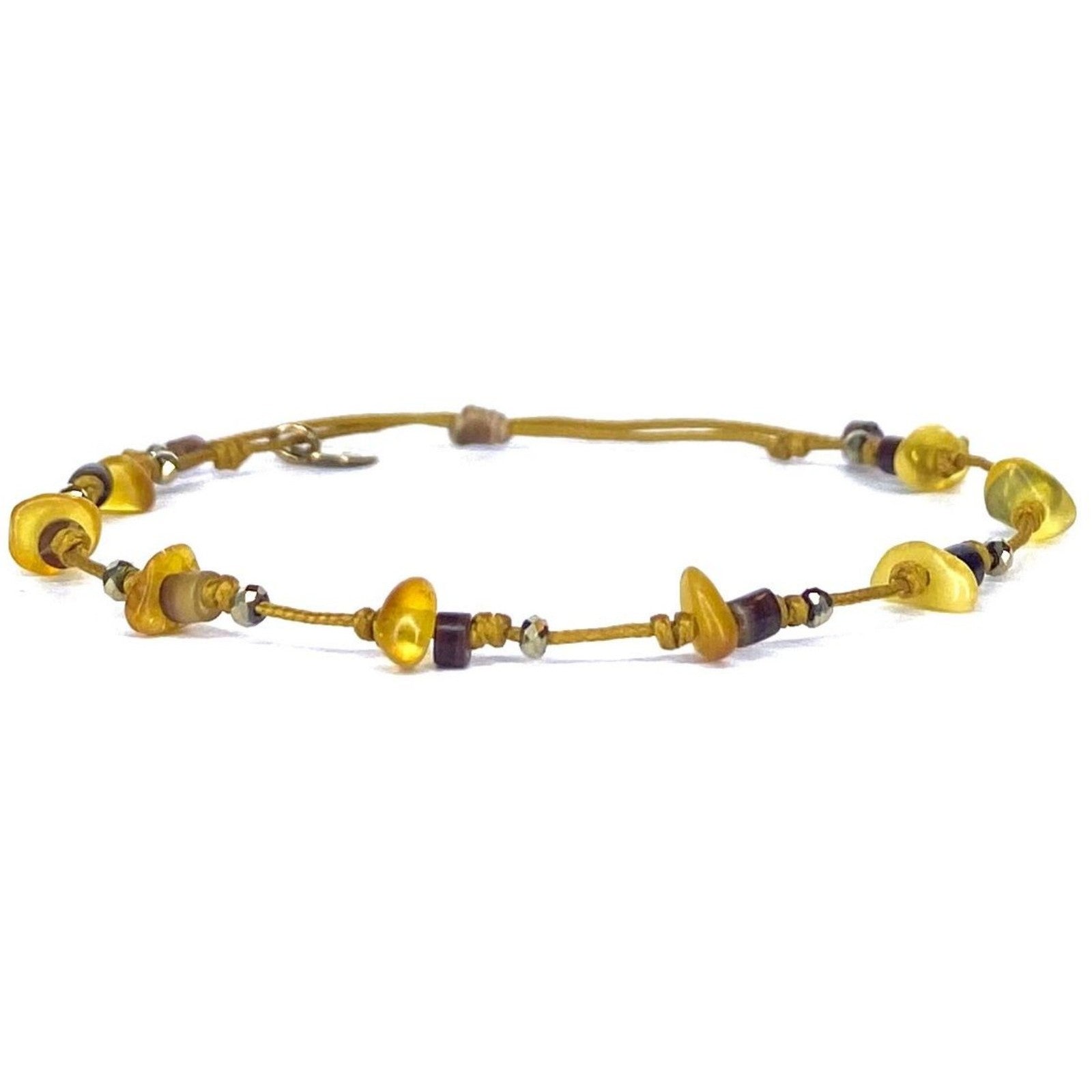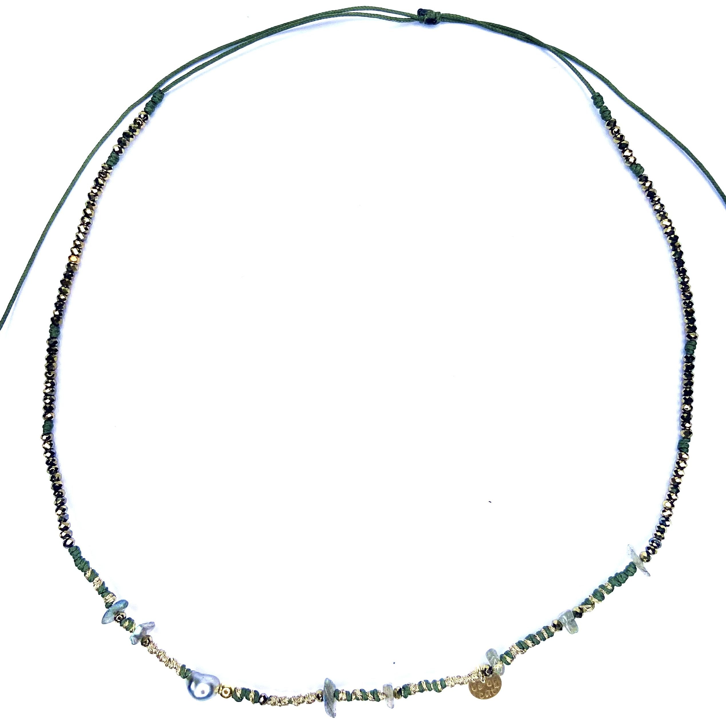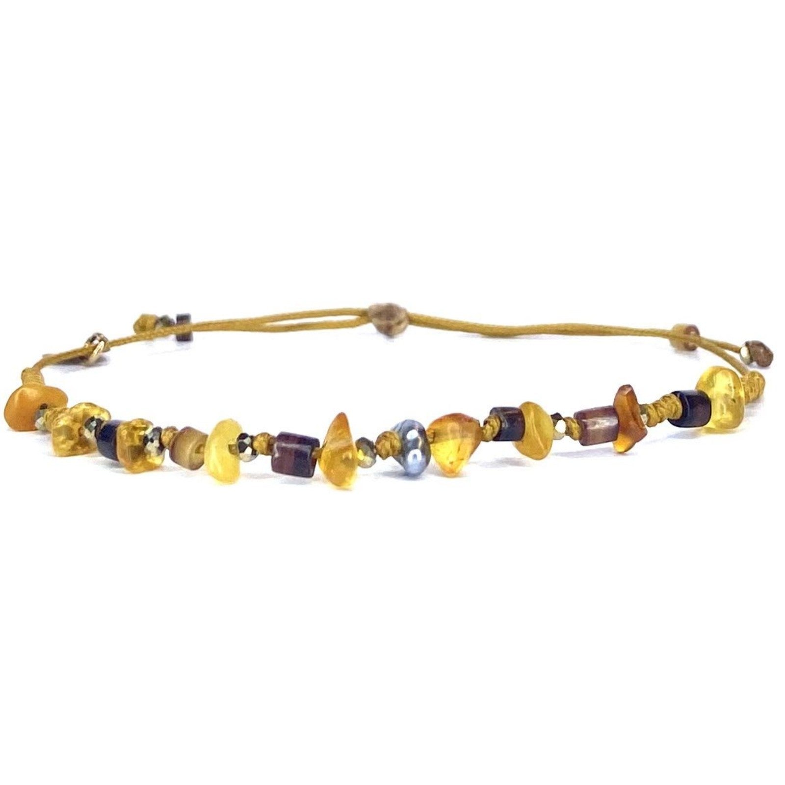 La collection de bijoux Ethnic propose des bracelets et des colliers ethniques faits de matériaux naturels comme l'ambre, la tourmaline la pyrite, l'hématite et les perles Keshi de Tahiti. Ils sont montés sur des liens coulissants mordorés ou camel, ou avec des fermoirs en argent ou dorure or.