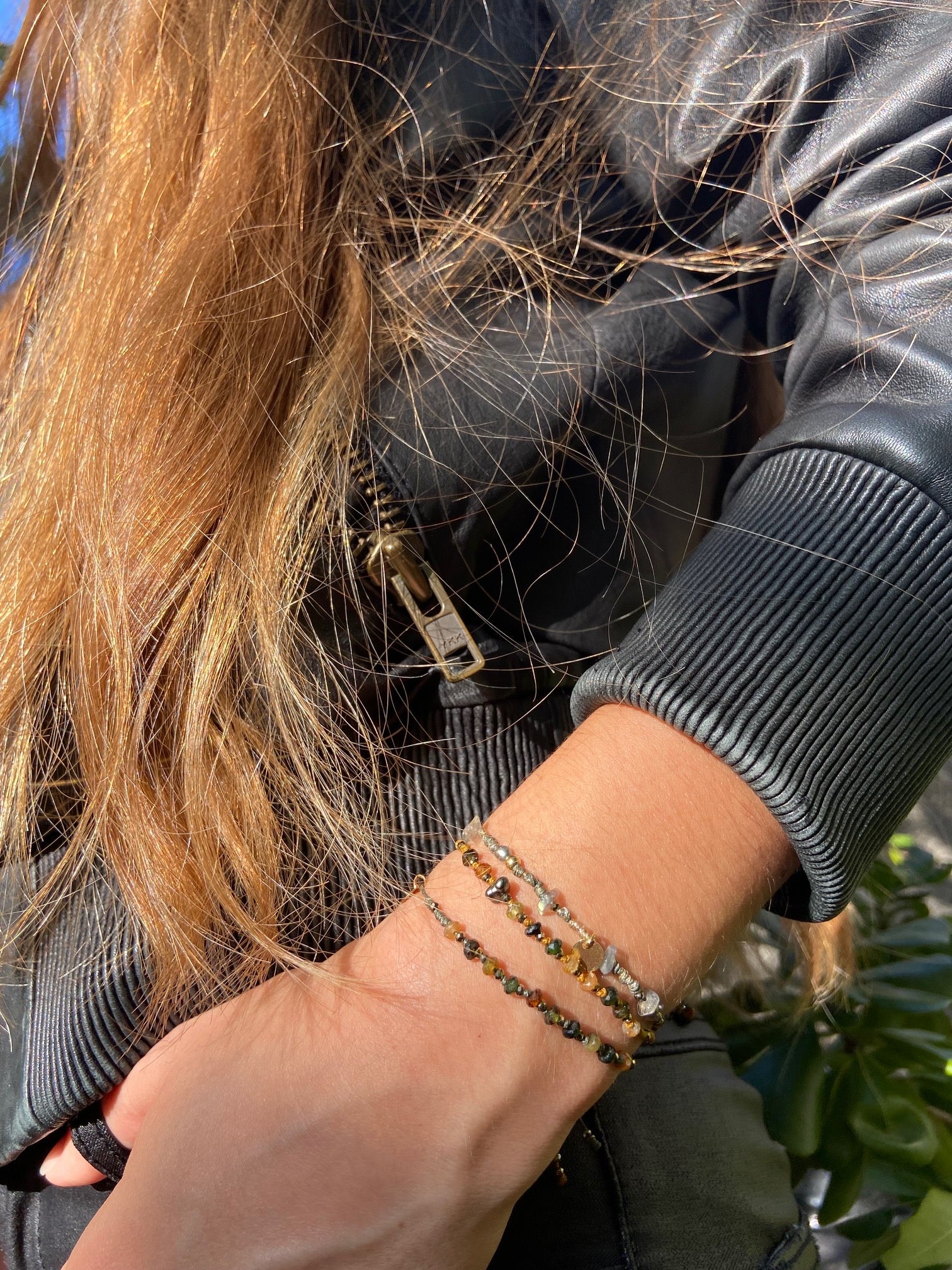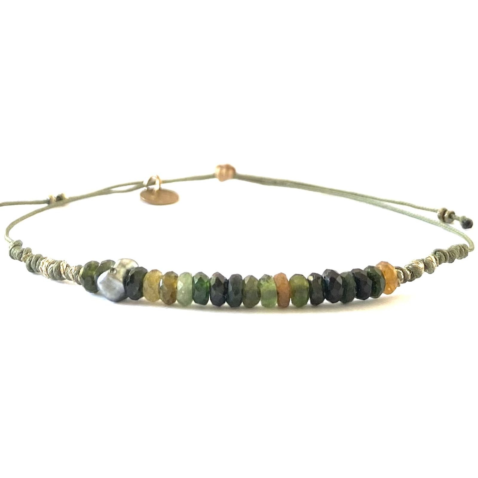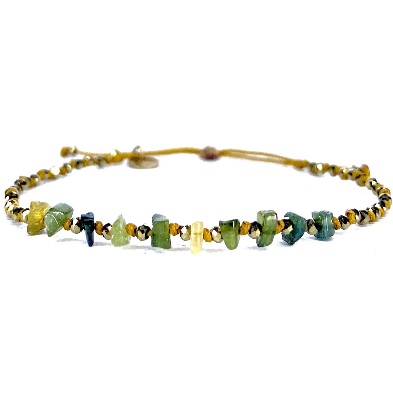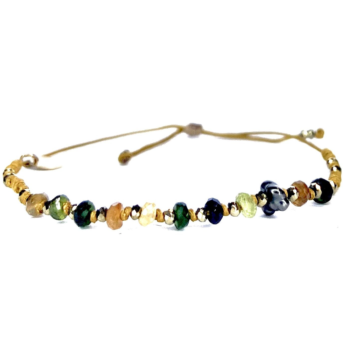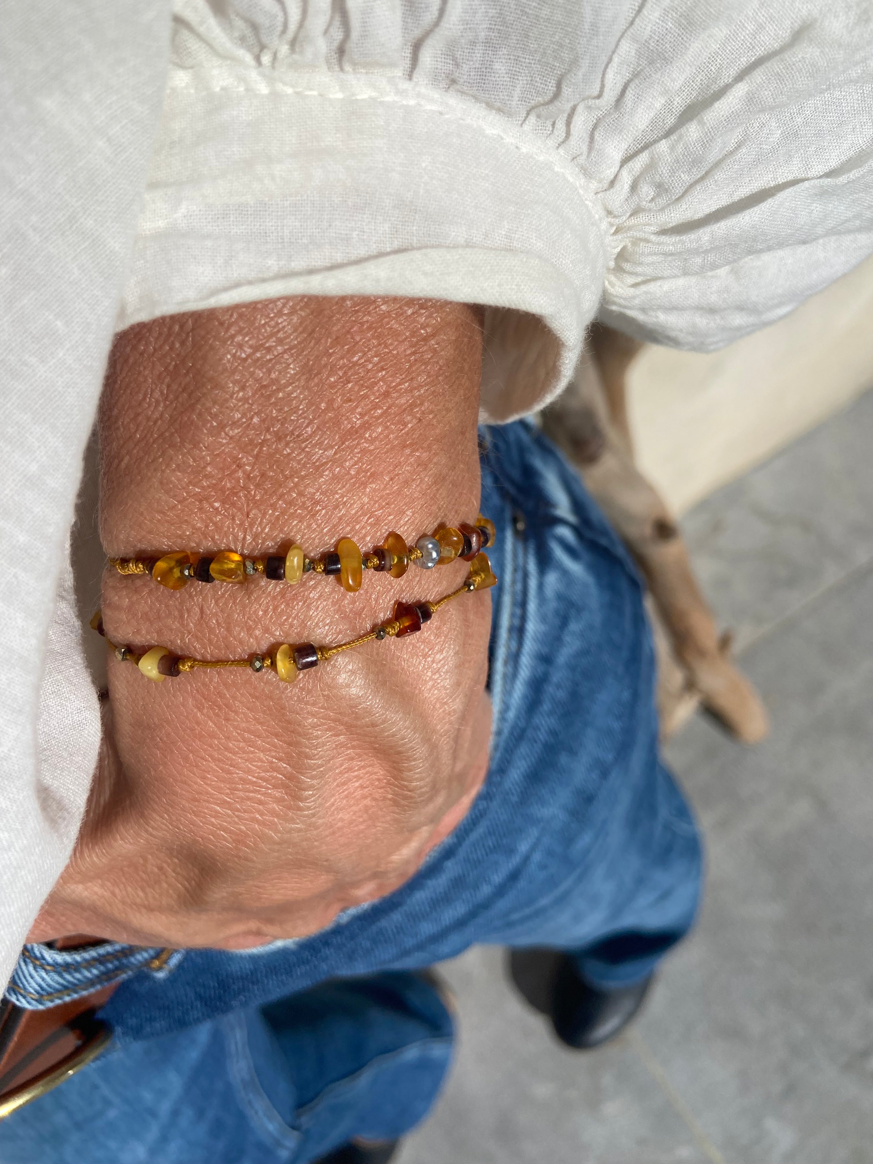La collection de bijoux Ethnic propose des bracelets et des colliers ethniques faits de matériaux naturels comme l'ambre, la tourmaline la pyrite, l'hématite et les perles Keshi de Tahiti. Ils sont montés sur des liens coulissants mordorés ou camel, ou avec des fermoirs en argent ou dorure or.