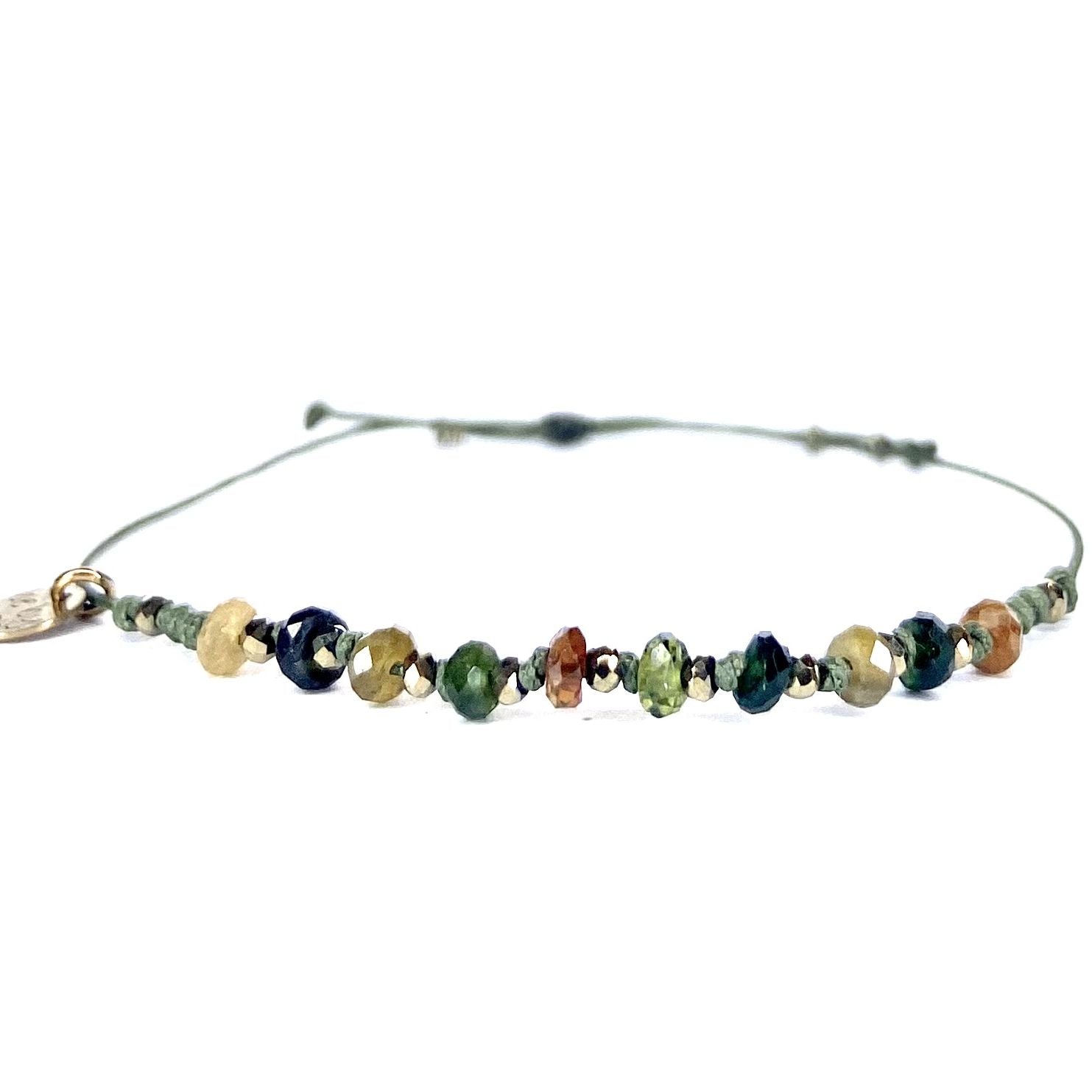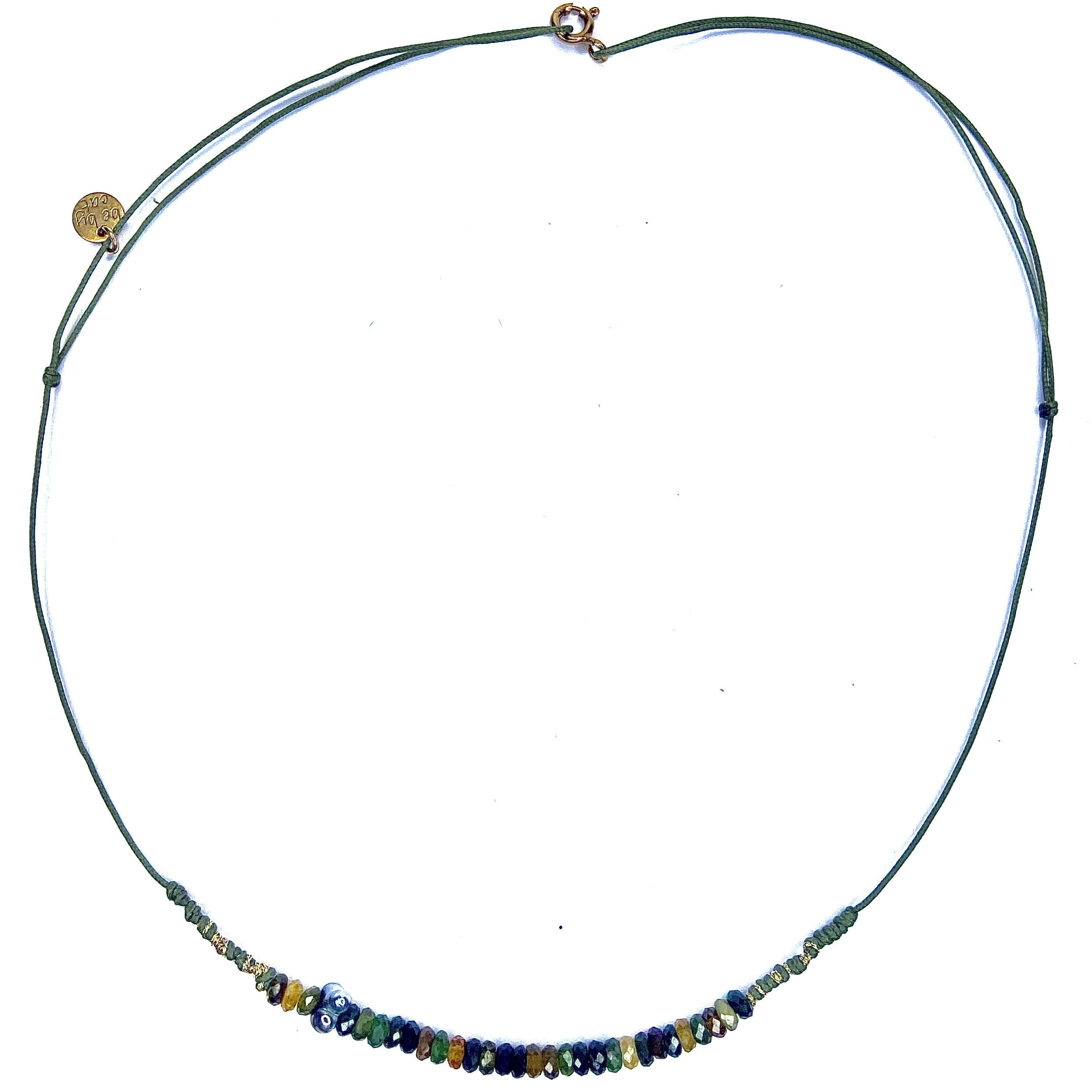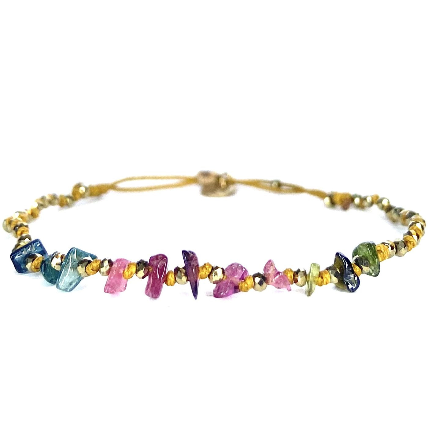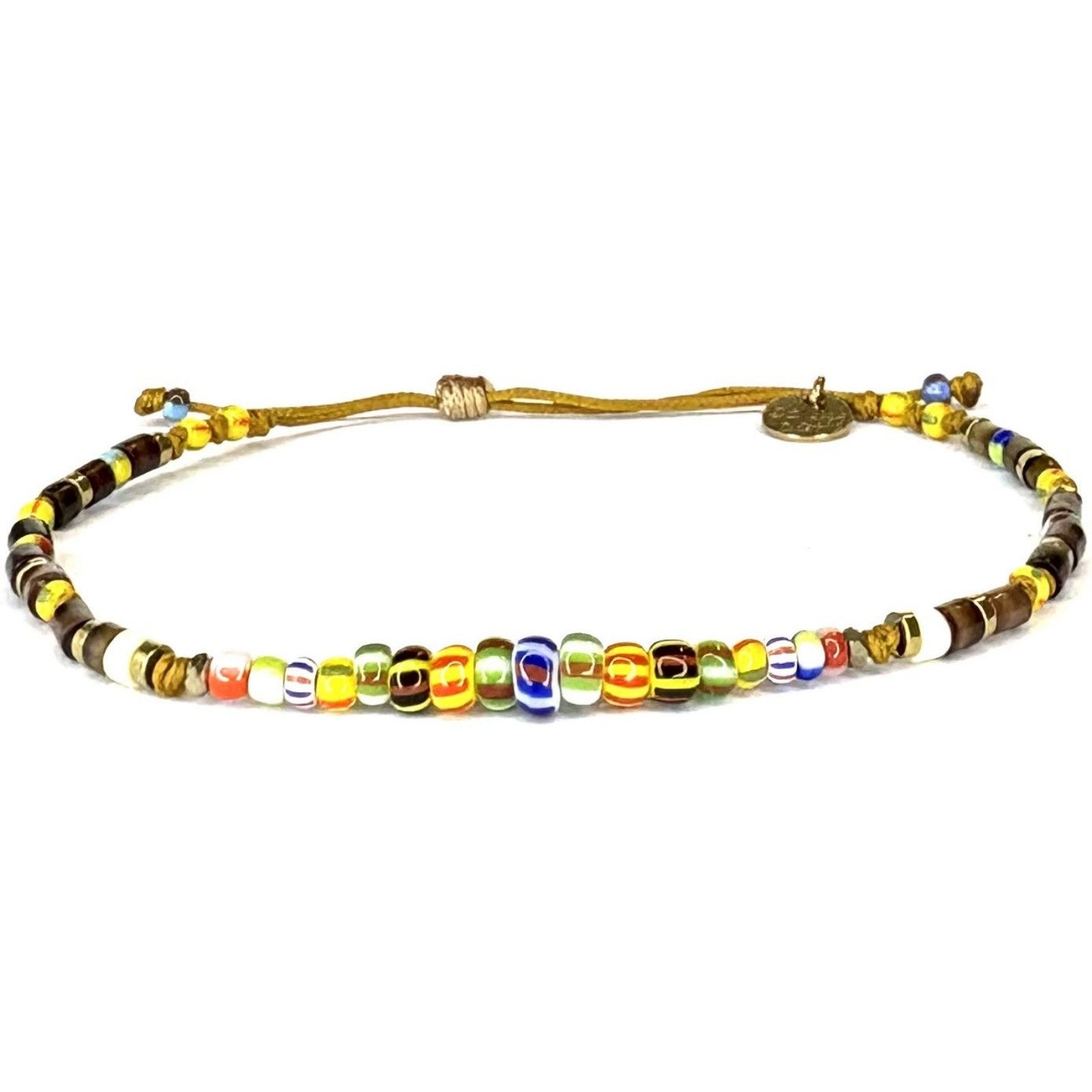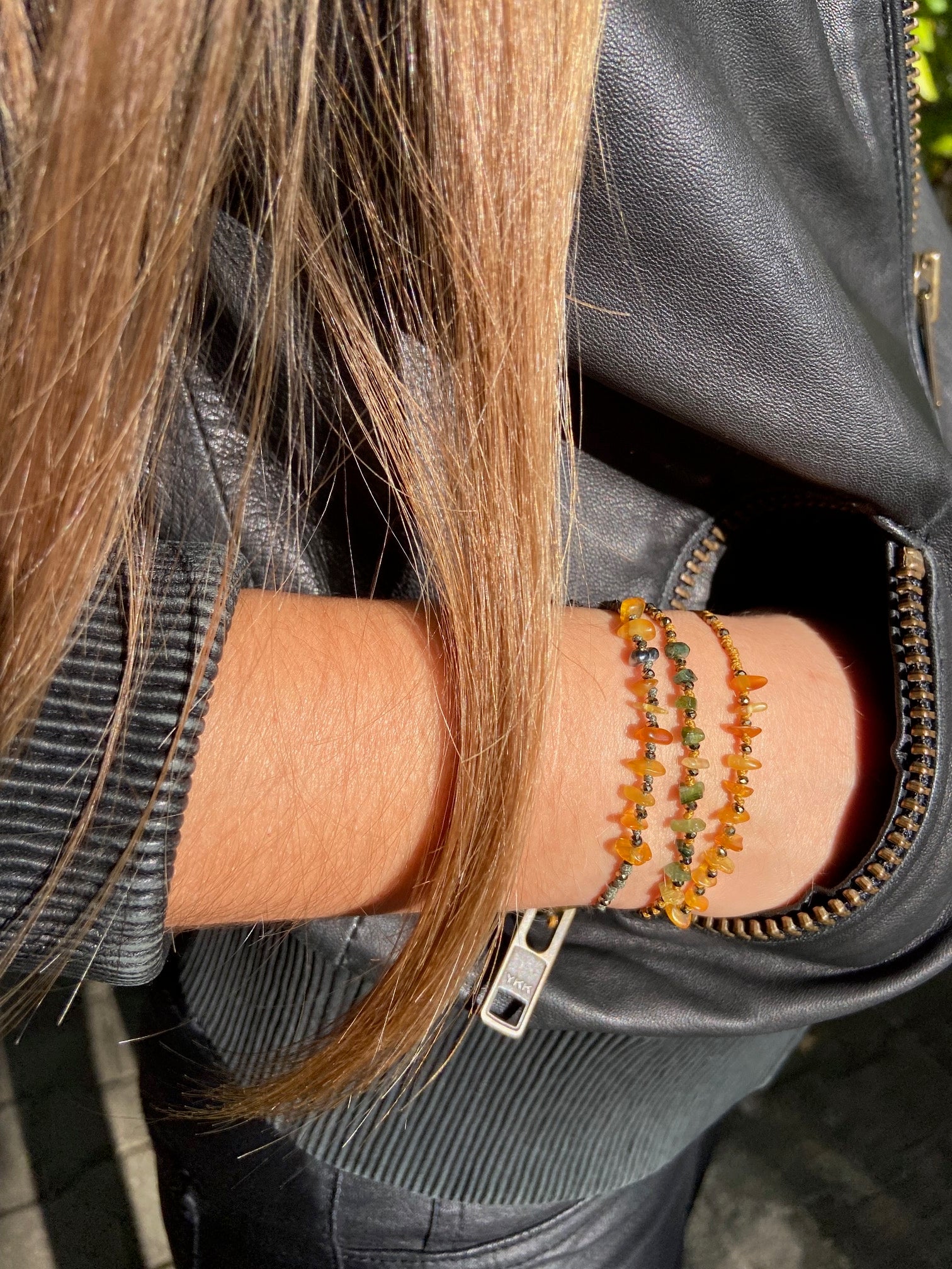 La collection de bijoux Ethnic propose des bracelets et des colliers ethniques faits de matériaux naturels comme l'ambre, la tourmaline la pyrite, l'hématite et les perles Keshi de Tahiti. Ils sont montés sur des liens coulissants mordorés ou camel, ou avec des fermoirs en argent ou dorure or.