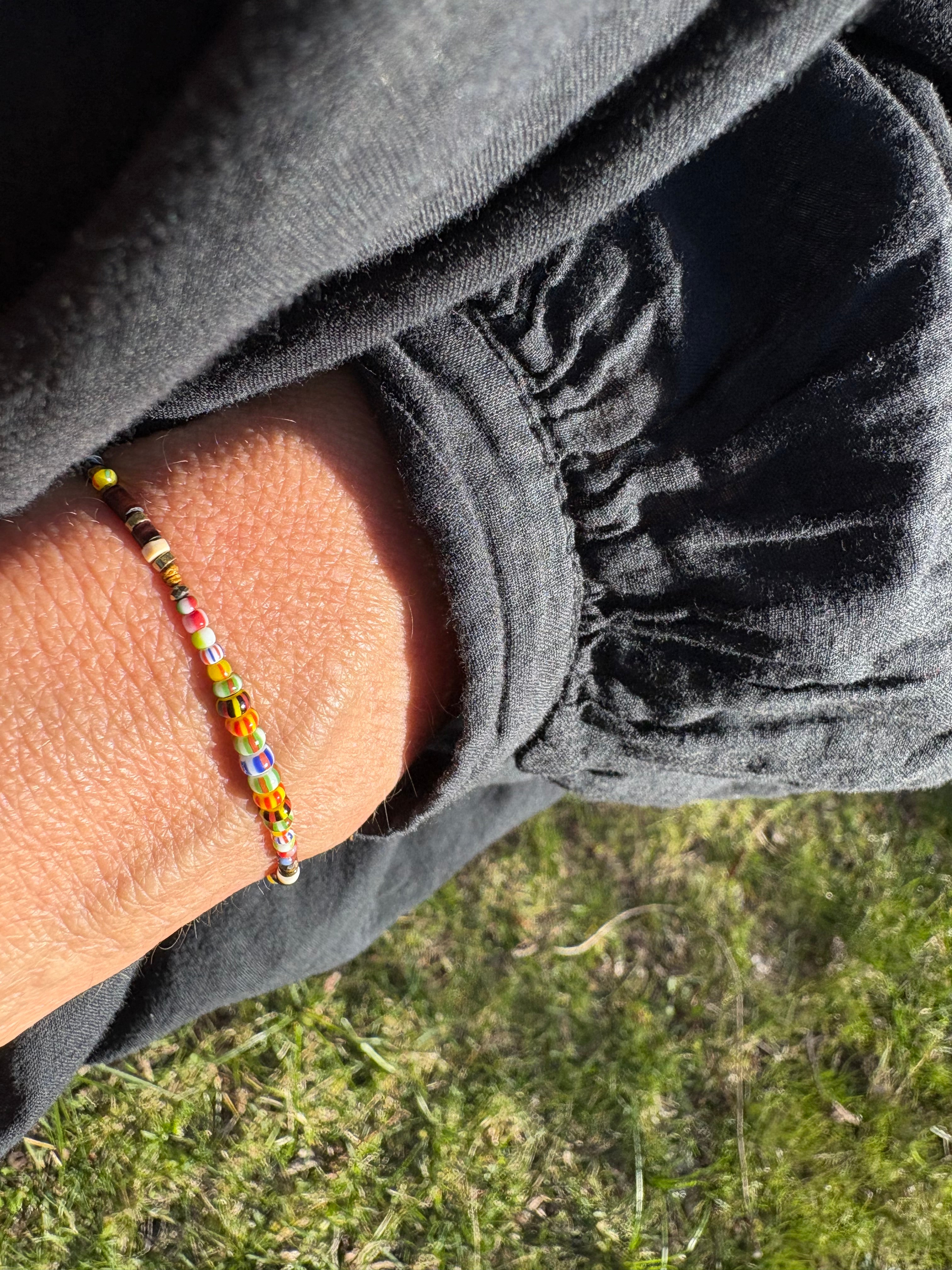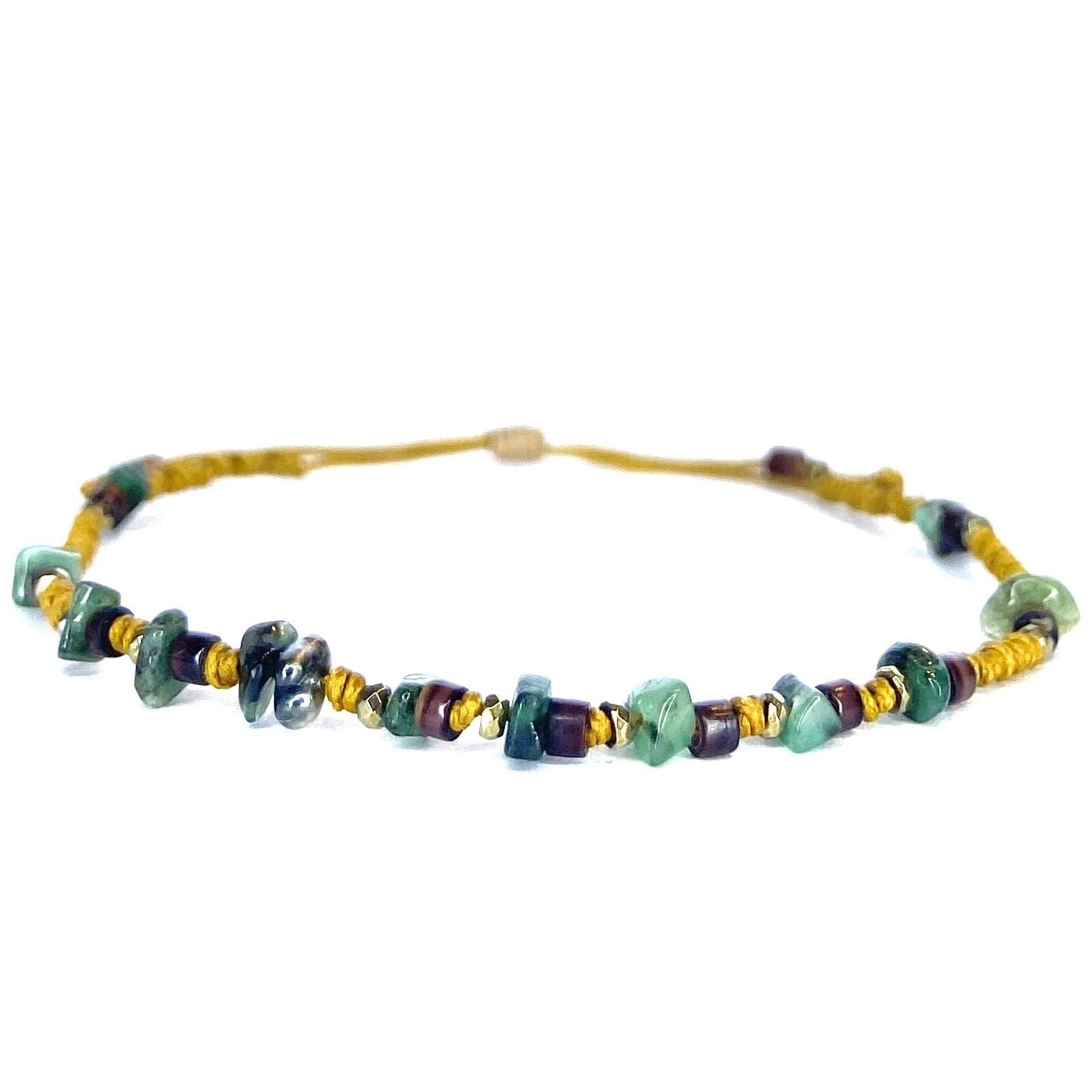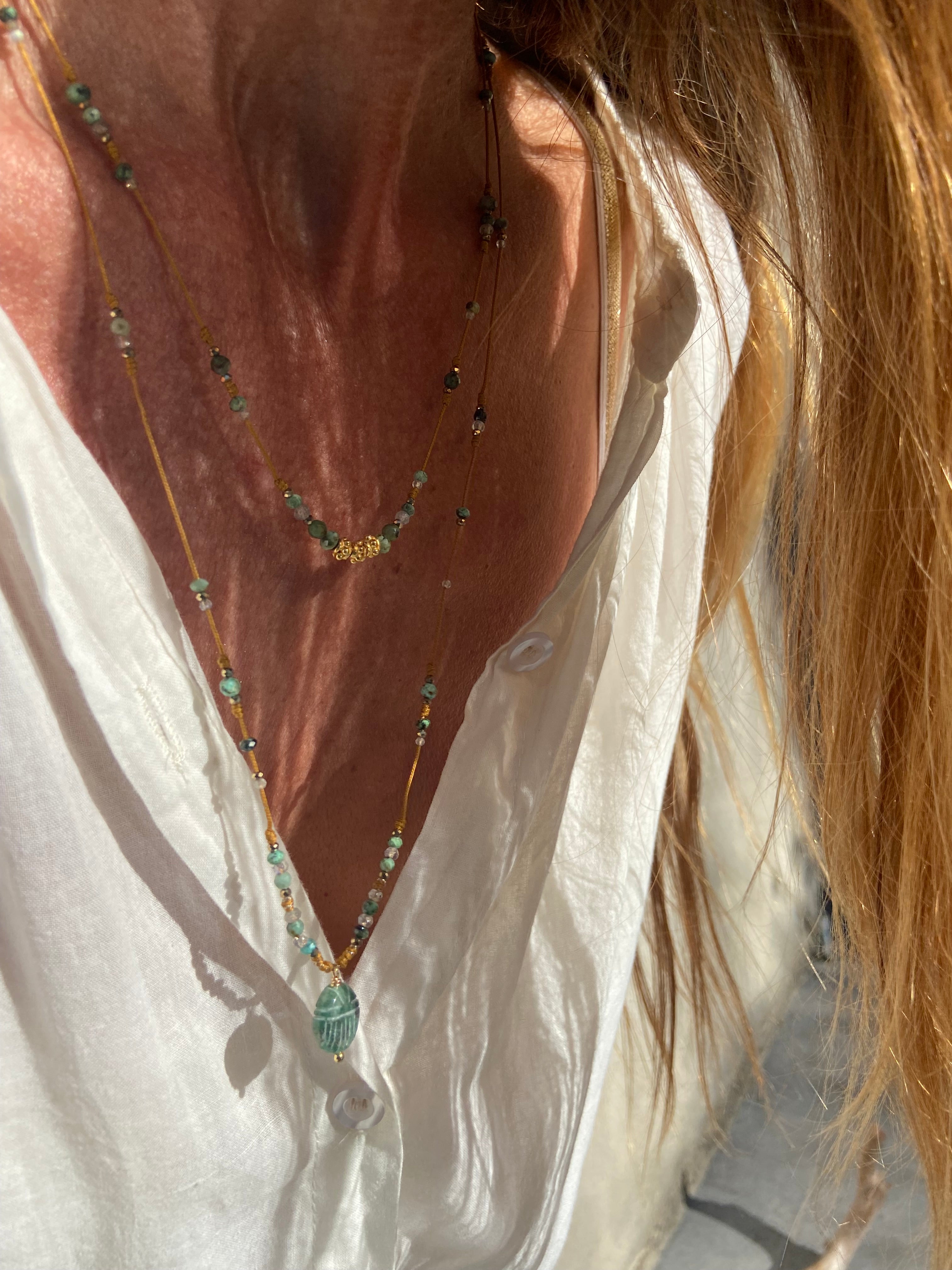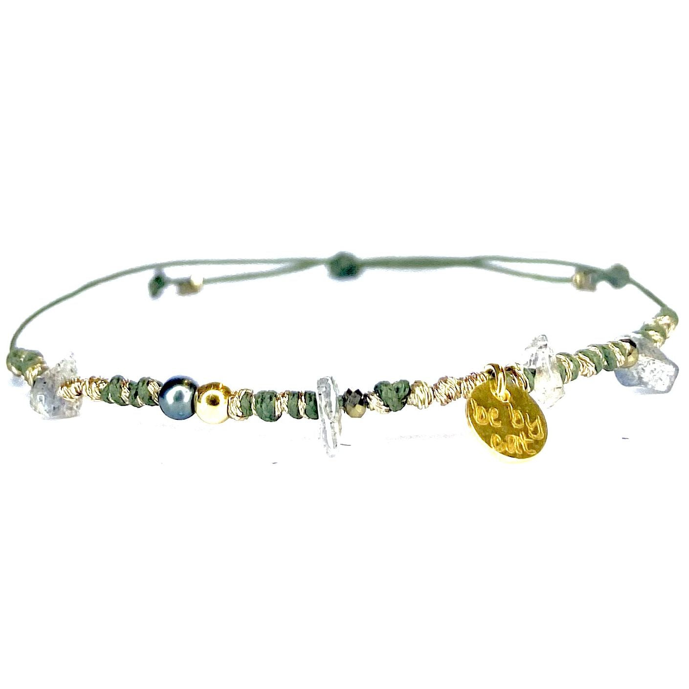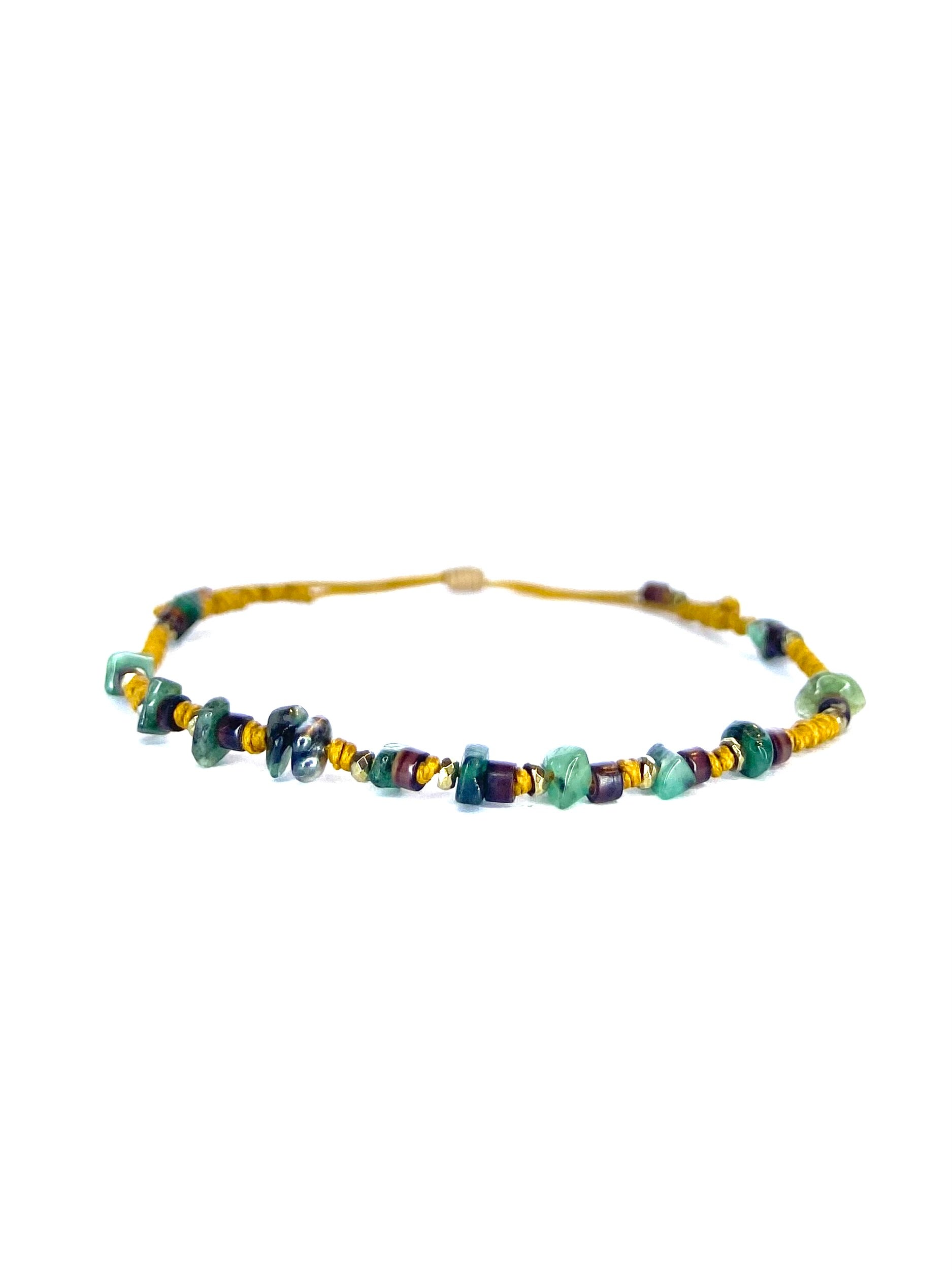 La collection de bijoux Ethnic propose des bracelets et des colliers ethniques faits de matériaux naturels comme l'ambre, la tourmaline la pyrite, l'hématite et les perles Keshi de Tahiti. Ils sont montés sur des liens coulissants mordorés ou camel, ou avec des fermoirs en argent ou dorure or.