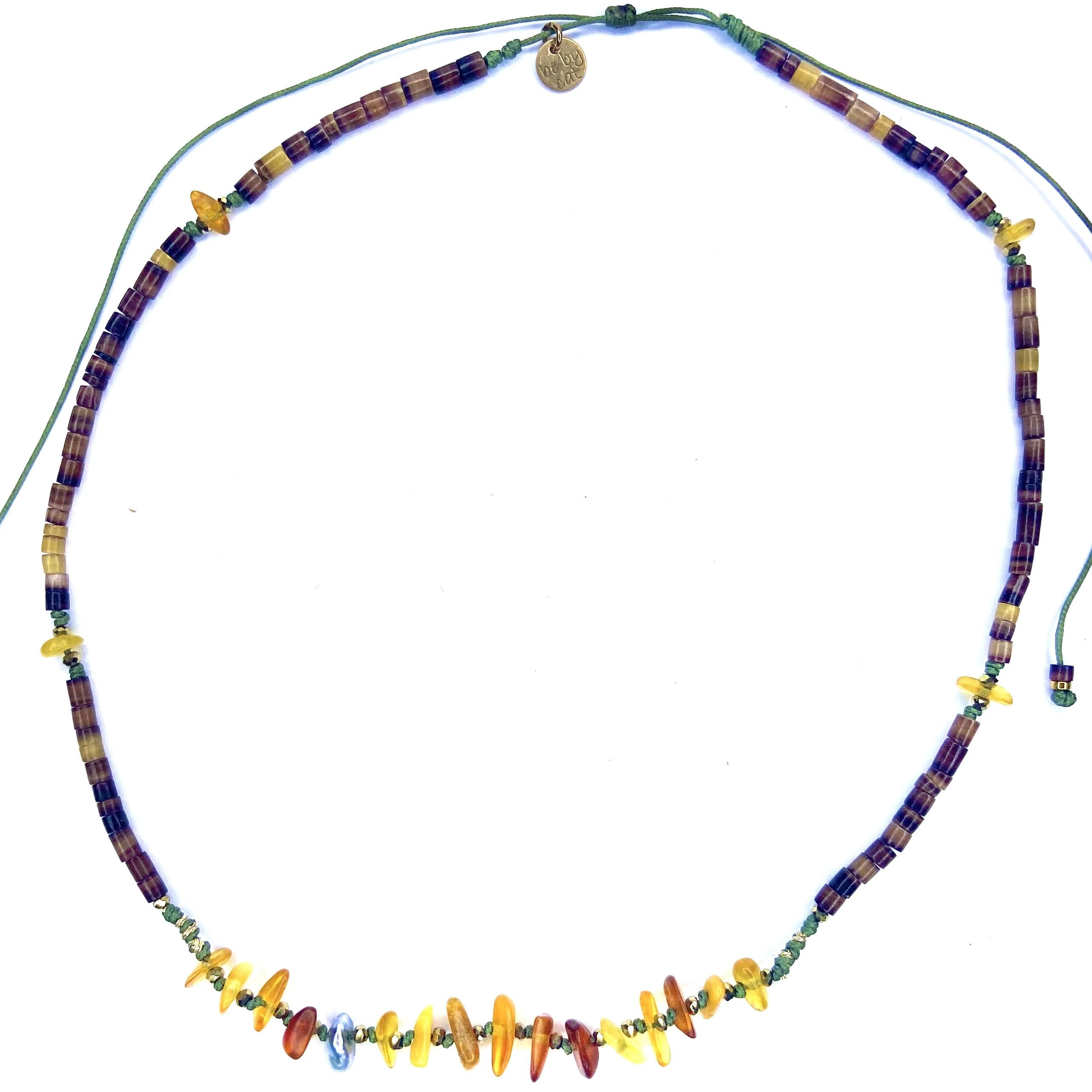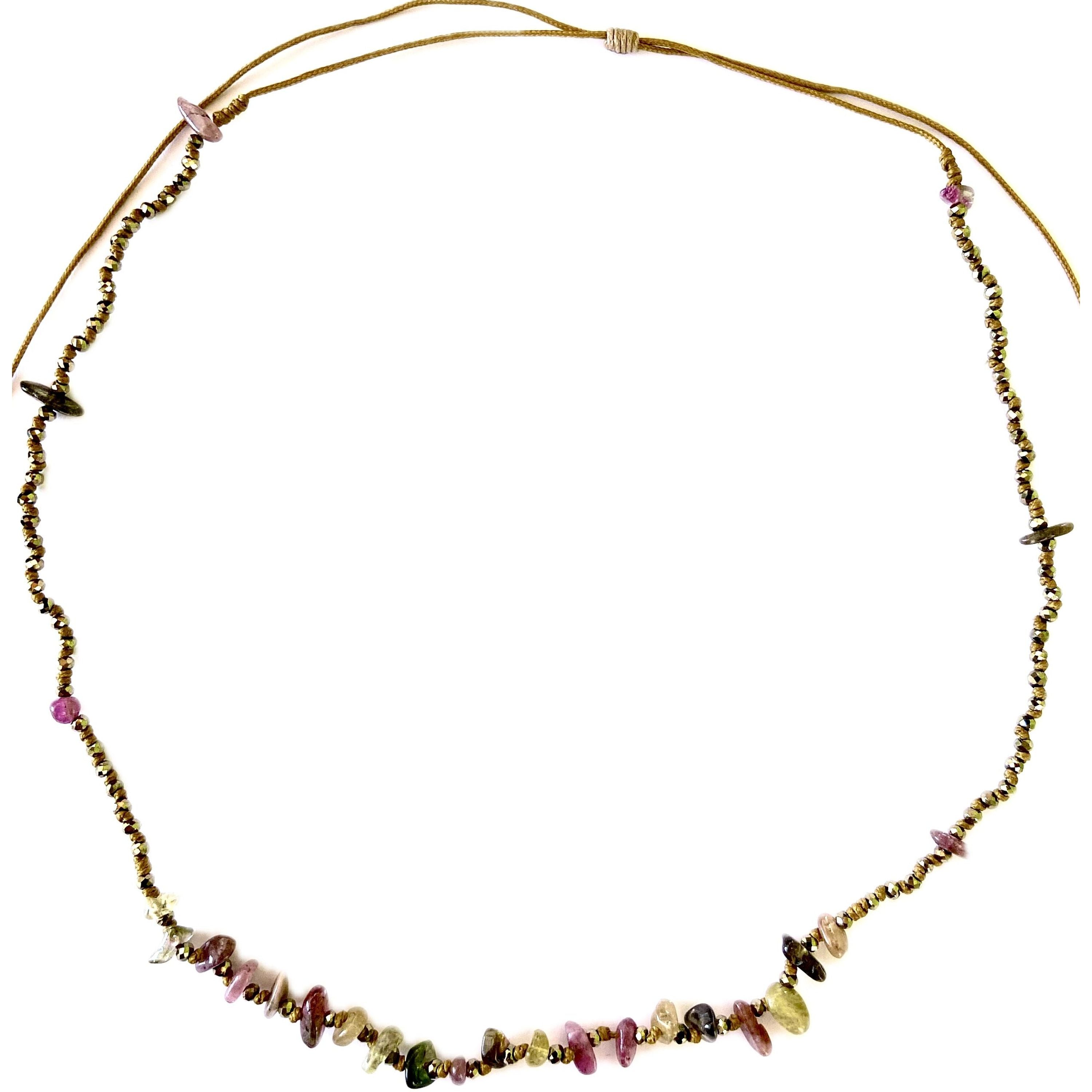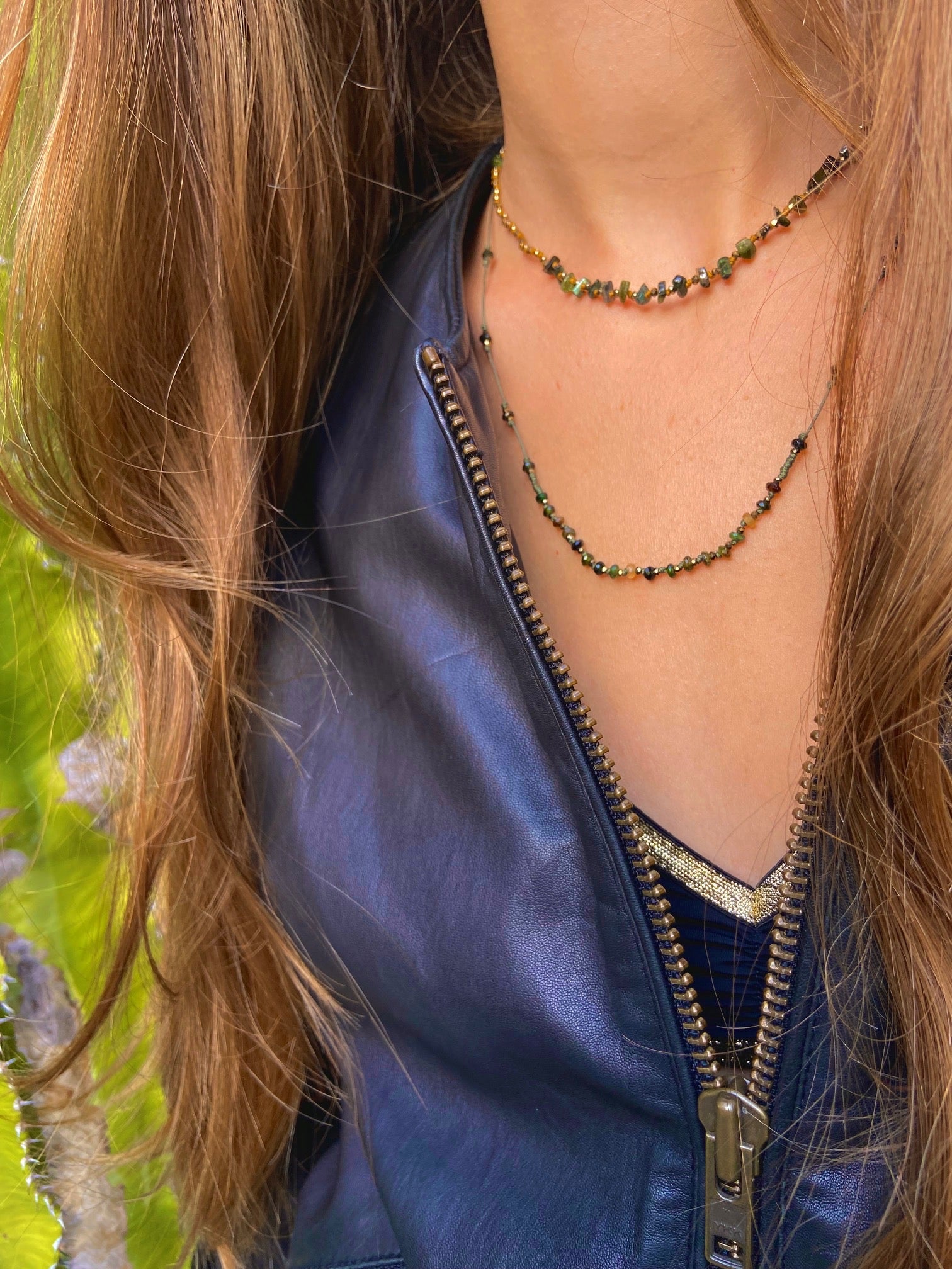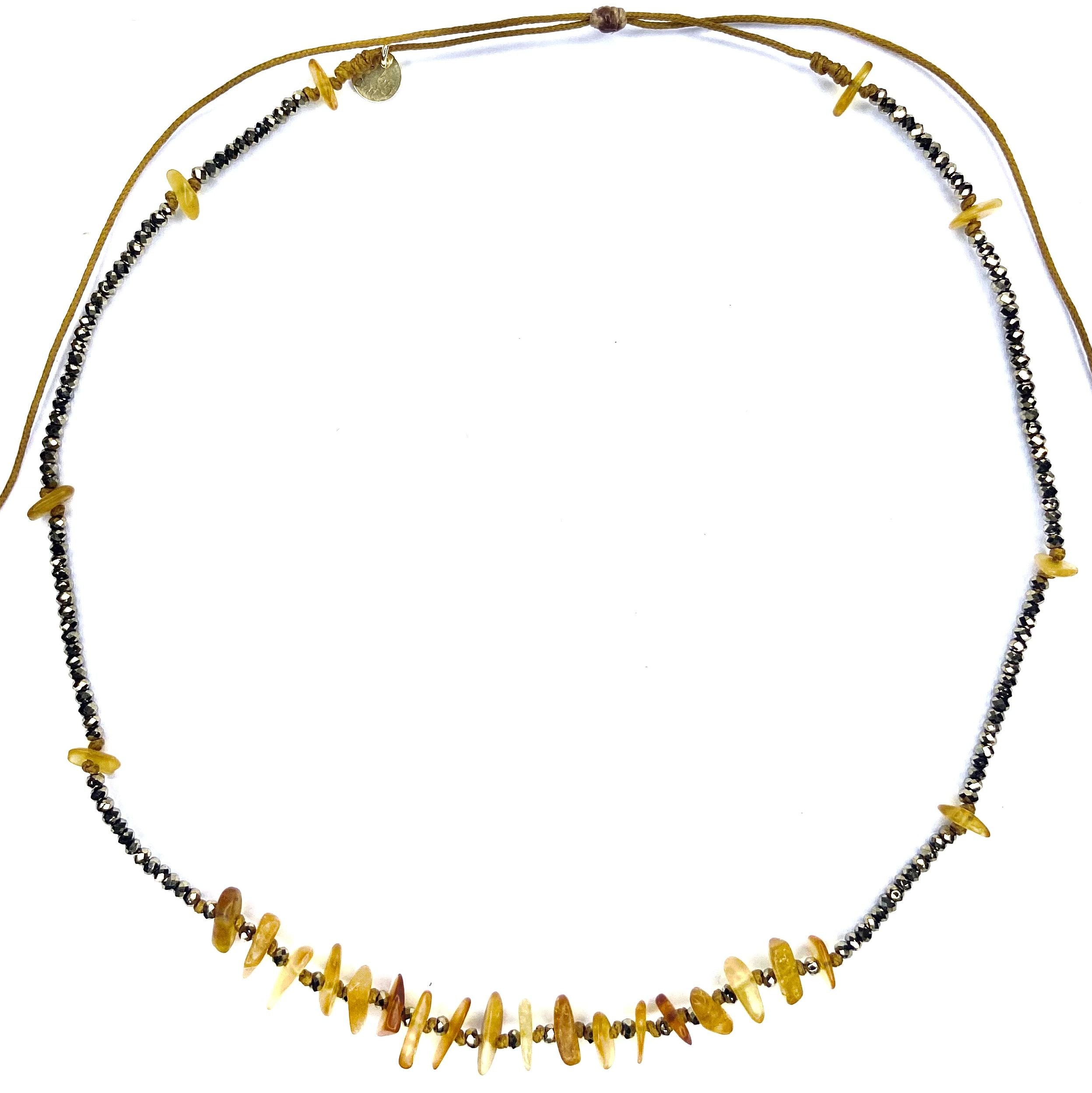 La collection de bijoux Ethnic propose des bracelets et des colliers ethniques faits de matériaux naturels comme l'ambre, la tourmaline la pyrite, l'hématite et les perles Keshi de Tahiti. Ils sont montés sur des liens coulissants mordorés ou camel, ou avec des fermoirs en argent ou dorure or.