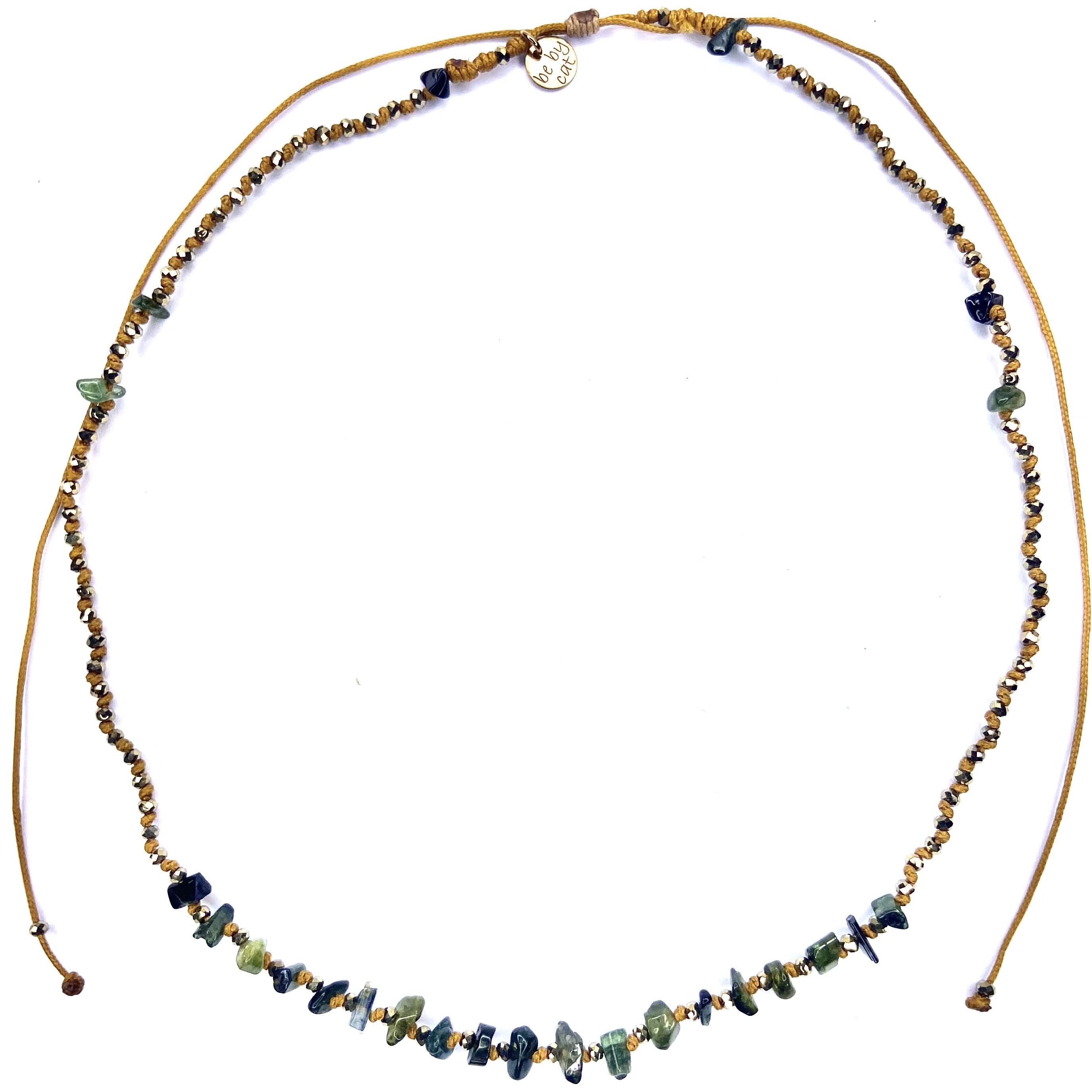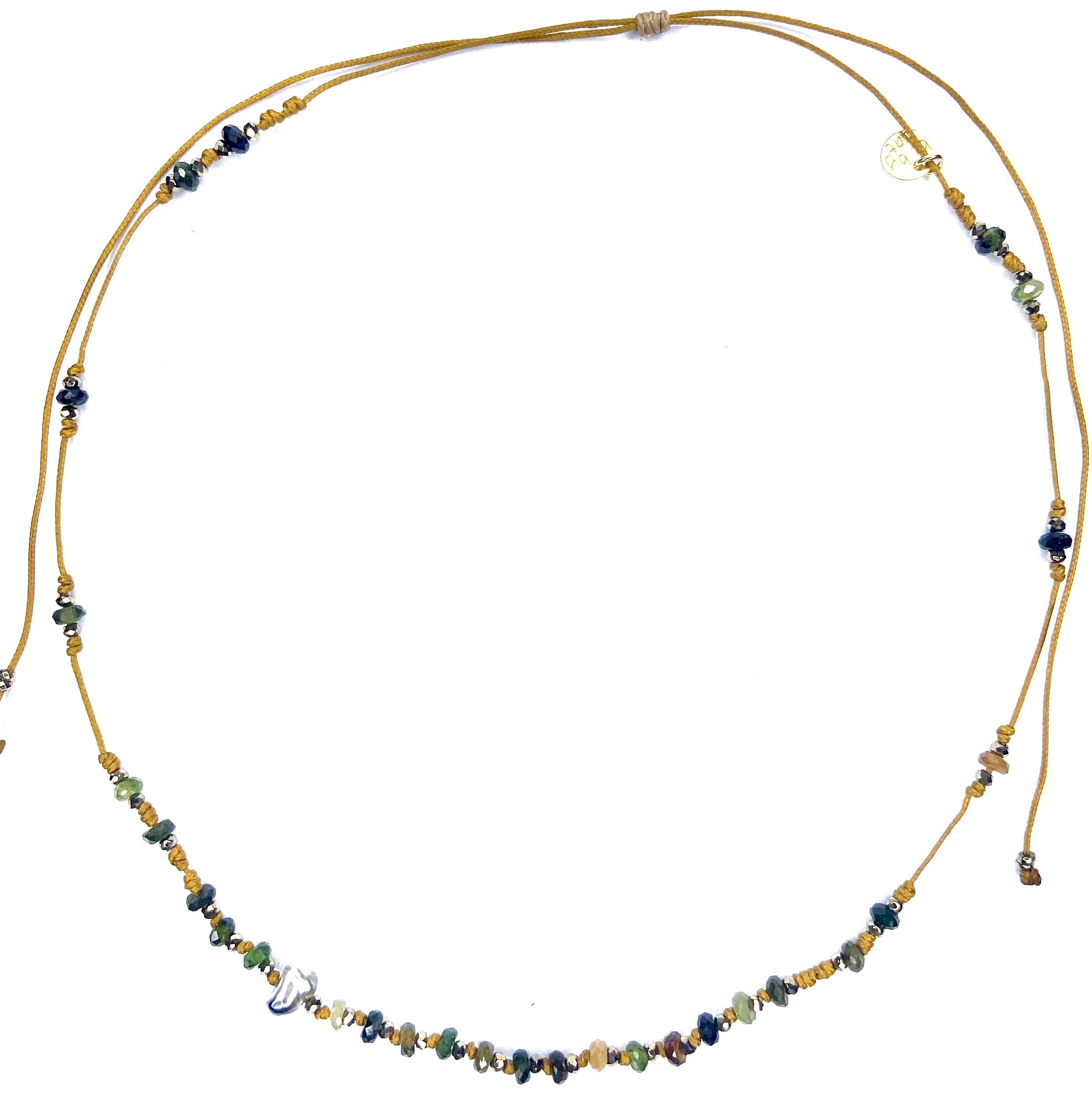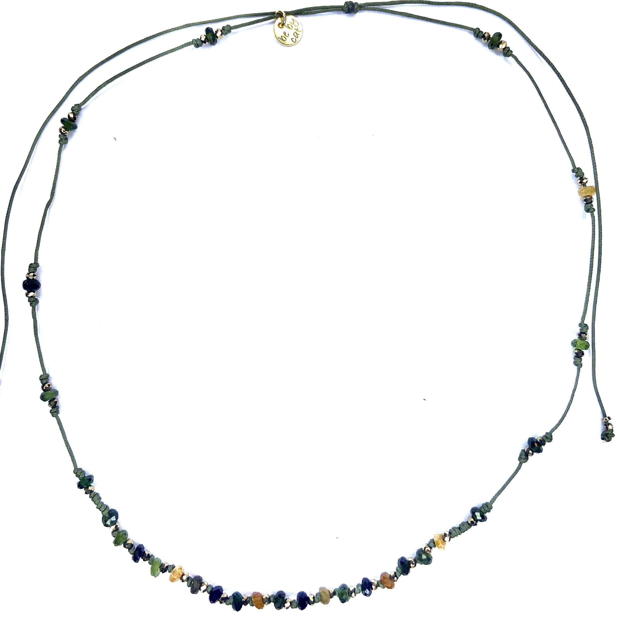 La collection de bijoux Ethnic propose des bracelets et des colliers ethniques faits de matériaux naturels comme l'ambre, la tourmaline la pyrite, l'hématite et les perles Keshi de Tahiti. Ils sont montés sur des liens coulissants mordorés ou camel, ou avec des fermoirs en argent ou dorure or.