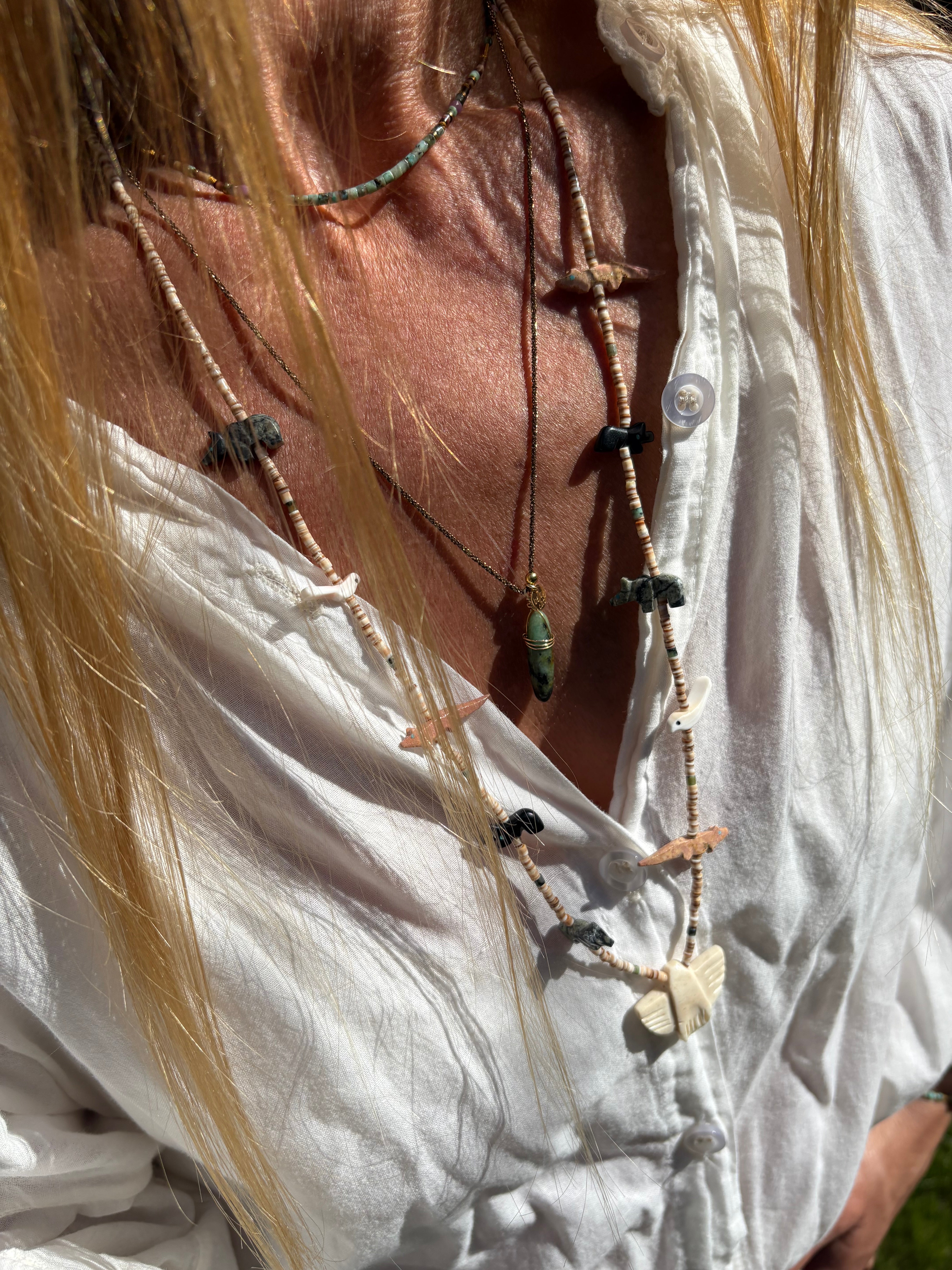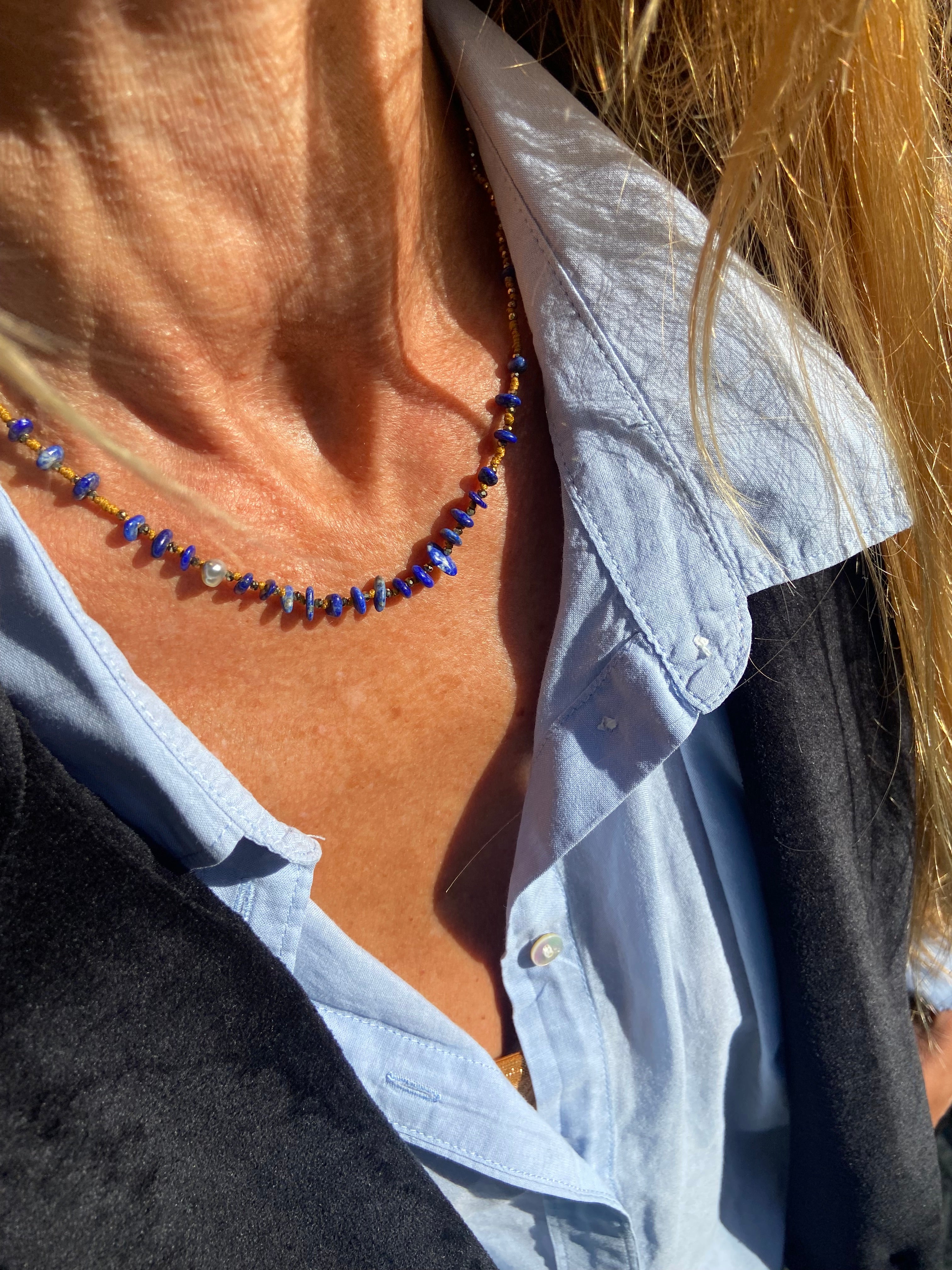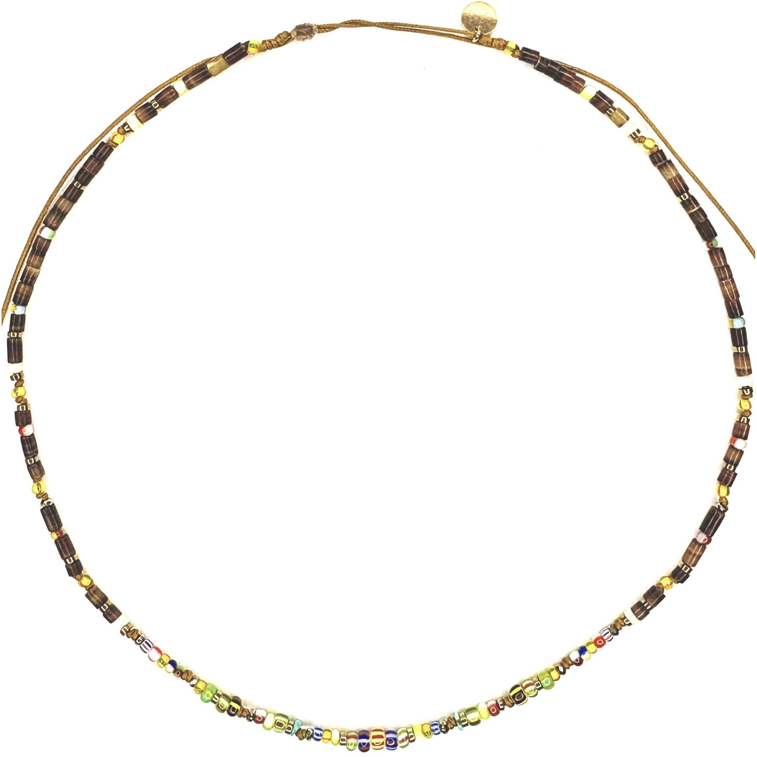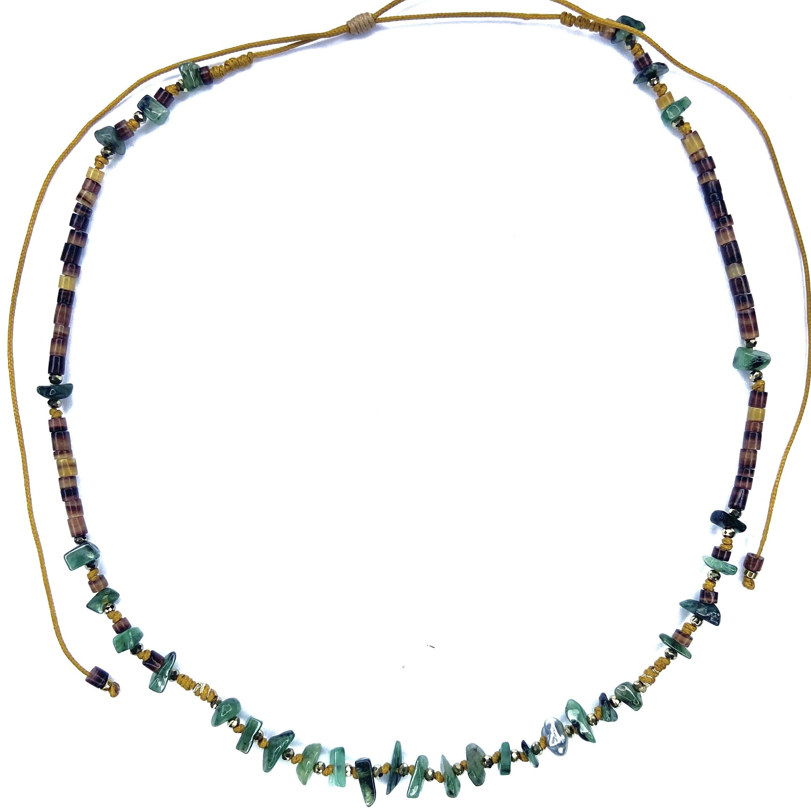 La collection de bijoux Ethnic propose des bracelets et des colliers ethniques faits de matériaux naturels comme l'ambre, la tourmaline la pyrite, l'hématite et les perles Keshi de Tahiti. Ils sont montés sur des liens coulissants mordorés ou camel, ou avec des fermoirs en argent ou dorure or.