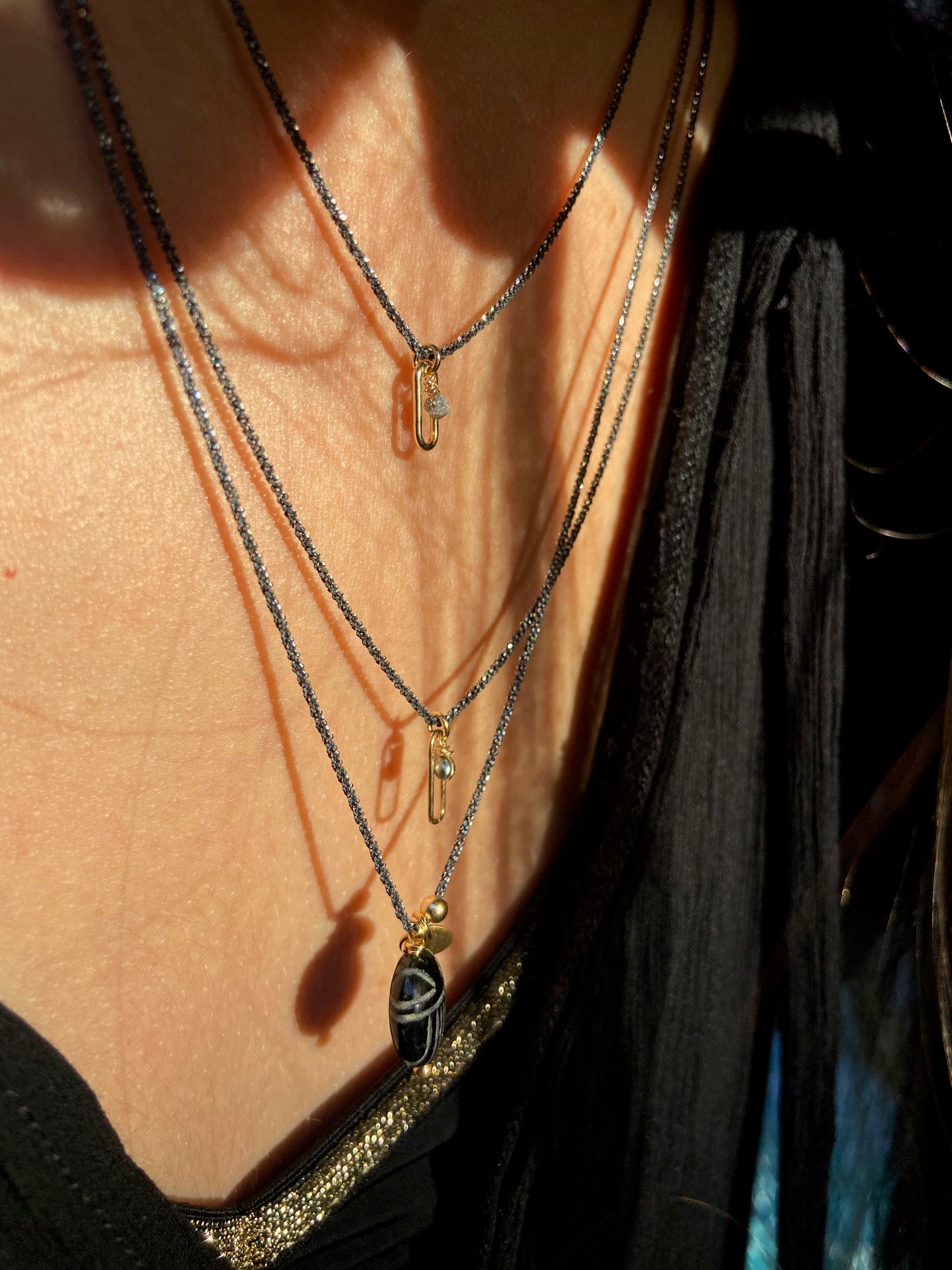 Découvrez la collection Intemporel, où l'élégance classique rencontre la modernité. Les bracelets et colliers en argent noir ou dorure or chocolat se distinguent par leurs pendentifs raffinés : œil porte-bonheur, perles Keshi, turquoises, et diamants bruts. Les chaînes réglables et les fermoirs plaqués or ajoutent une touche de sophistication. Les modèles, comme le bracelet "Œil noir Perle vermeil" ou le collier "Scarabée émeraude Boule", allient des matériaux nobles à un design intemporel, parfait pour sublimer votre style au quotidien.
